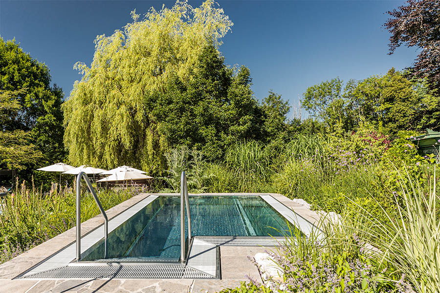 Es duftet nach Melisse und nach Heimkommen. Beeindruckende Blumenformationen, grüne Samtsofas, helle Hölzer und das strahlende Lächeln der Dame am Empfang lassen unser Herz aufgehen und geben uns das Gefühl, genau am richtigen Ort angekommen zu sein. Wir werden mit warmen feuchten Tüchern und zwei köstlichen Gläsern Prosecco willkommen geheißen, die wir an einem sonnigen Plätzchen im Innenhof genießen. Und schon ist der Rest, der Welt vergessen. Wen sollten wir nochmal anrufen, wenn wir angekommen sind? Egal. Jetzt sind wir hier und alles, was zählt, sind wir. Das war der Plan für das Wellness-Wochenende und genau so fühlt sich auch jeder Moment im Alpenhof Murnau an. Ob in unserem großzügigen Zimmer, wo ein frischer Obstkorb auf uns wartet, und der Balkon den Blick auf den herrlichen Garten, den einladenden Pool, das dahinterliegende Moor und die einrahmenden Berge freigibt, beim Schwitzen in einer der urigen Saunahütten oder beim abendlichen Drei- Gänge-Dinner. Selbst an der Bar, wo wir unsere Cocktails sofort zum neuen Lieblingsgetränk küren, macht sich dieses wohlige Gefühl breit.