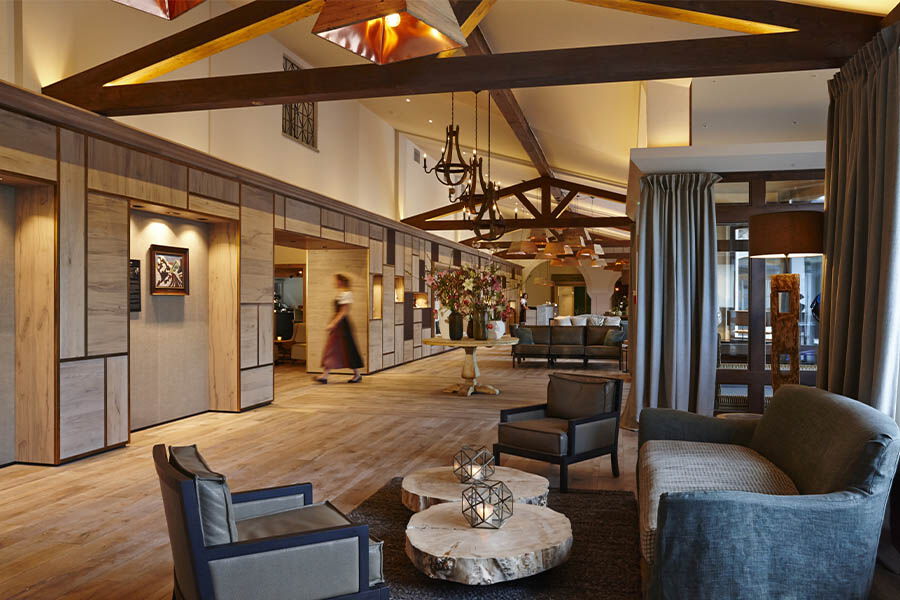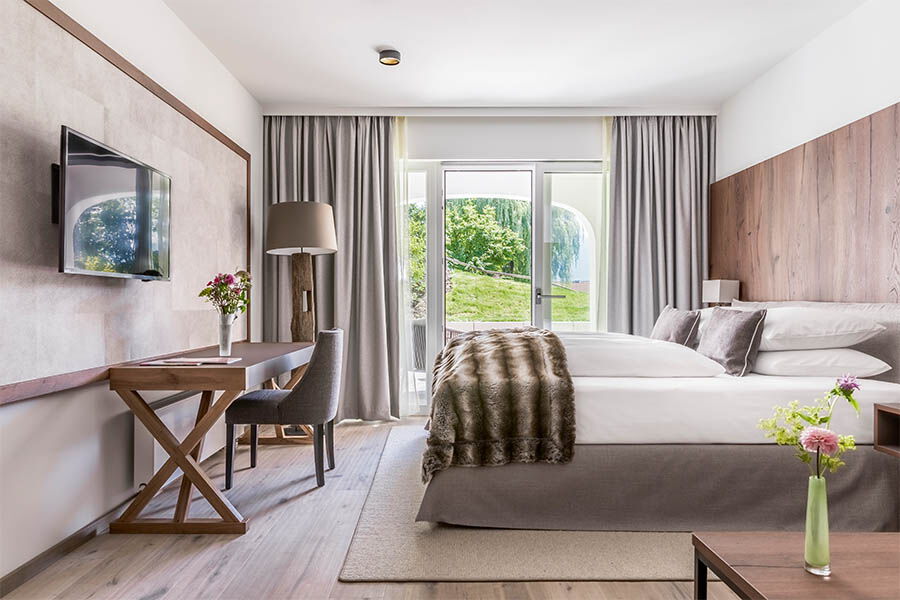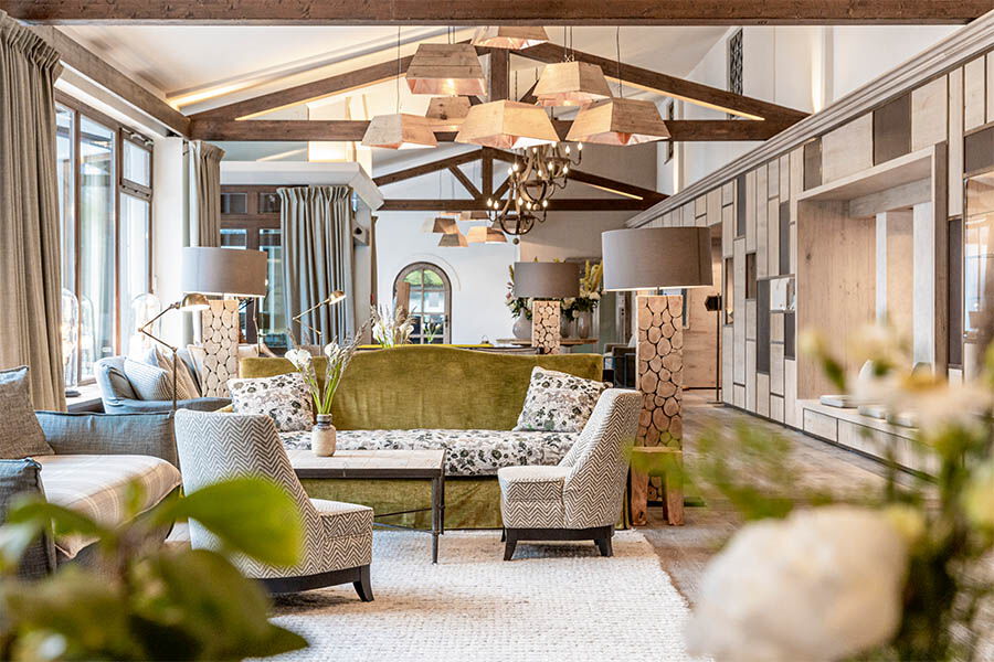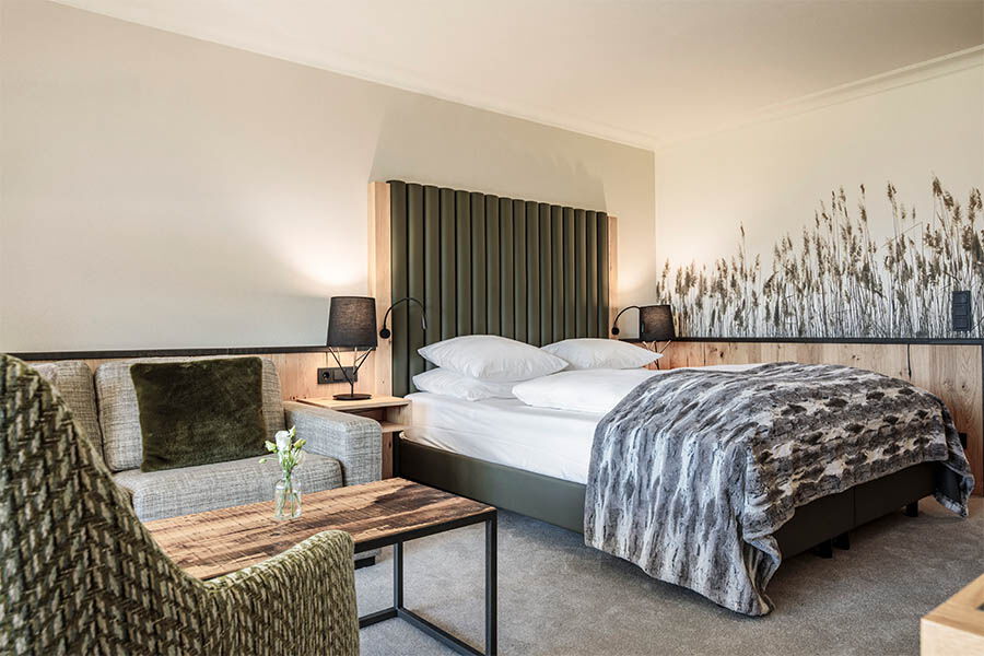 Eingebettet in die malerische Landschaft des Blauen Landes, ragen die Wurzeln des Alpenhofes Murnau bis zurück in die 70er Jahre, als das Hotel noch eine Tankstelle mit Motel in der Nähe der Autobahn werden sollte. Die A 95 wurde dann glücklicherweise an Murnau vorbei geleitet, sodass der Ort seine herrliche Ruhe und den ursprünglichen Charme behalten konnte. Viele Jahre später übernahm Christian Bär mit seiner Frau Elke die Leitung des heutigen 5-Sterne-Hotels. Seitdem hat der gebürtige Murnauer viel verändert. Seine Liebe zur Natur, vor allem für das Murnauer Moos, aber auch für die Kunst, für die Menschen im Ort und in seinem Unternehmen ist geblieben und überträgt sich über seine Mitarbeiter bis hin zu den Gästen. Dies spüren wir auch in der Begegnung mit der jungen Marketingleiterin Nadja Baarfüßer, die uns durch das Hotel führt und von seiner Historie erzählt. Heute erwarten 104 individuell gestaltete Zimmer und Suiten mit Balkon oder Terrasse in warmen Tönen auf die Gäste.