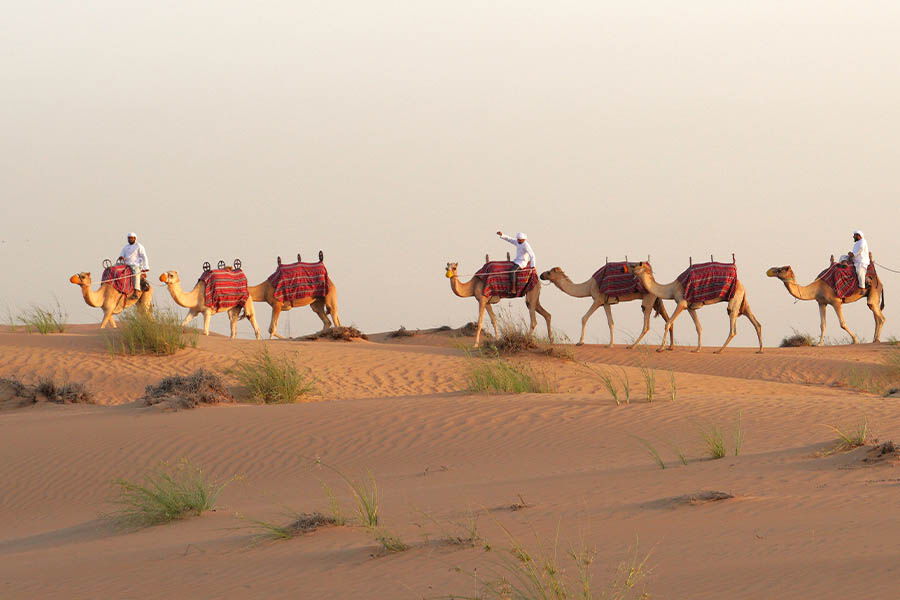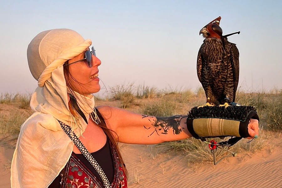 Unser nächster Stopp führt zu einem Lager aus Teppichen und Kissen, wo wir süßen Tee gereicht bekommen und fasziniert die Vorstellung eines Falkners und seines majestätischen Tiers verfolgen. Als der Wildvogel seine Haube abgenommen bekommt und kreischend vor der dramatischen Kulisse der in der Wüste versinkenden Sonne in den Himmel aufsteigt, wünsche ich mir, ich könnte mit ihm über dieses geheimnisvolle Land fliegen, dessen Wüsten von Freiheit flüstern und dessen Traditionen doch so beengend wirken. Zum krönenden Abschluss erreichen wir ein von Fackeln beleuchtetes traditionelles Beduinen-Camp. Dort erwarten uns eine Kamelherde, gemütliche Feuerstellen, ein authentisch zubereitetes 4-Gänge-Menü, eine Brotbackstation, eine Henna-Künstlerin, mehrere Shisha Pfeifen und eine Musik- und Tanzdarbietung, die uns unter dem leuchtenden Sternenhimmel in einen märchenhaften Traum aus 1001 Nacht entführen.