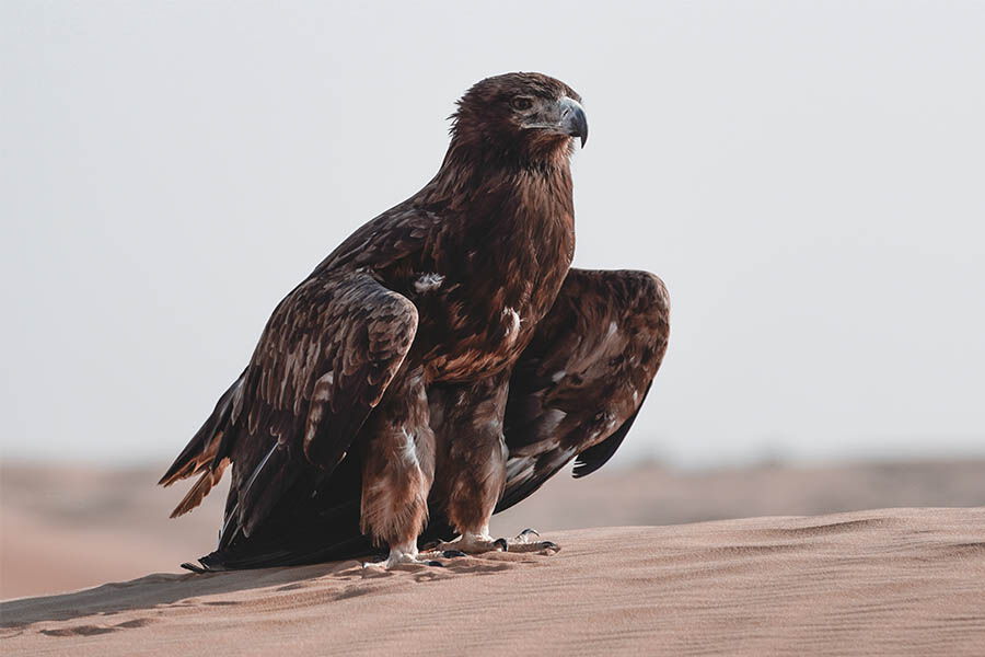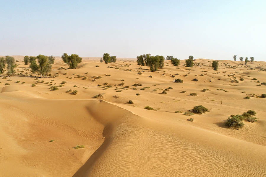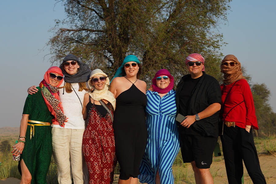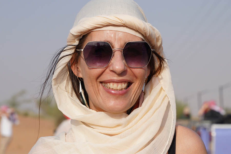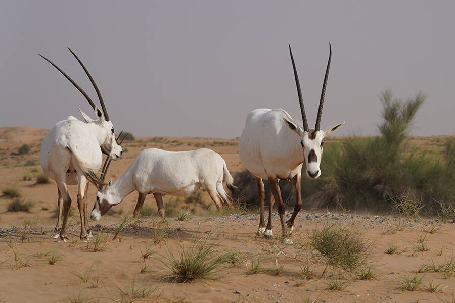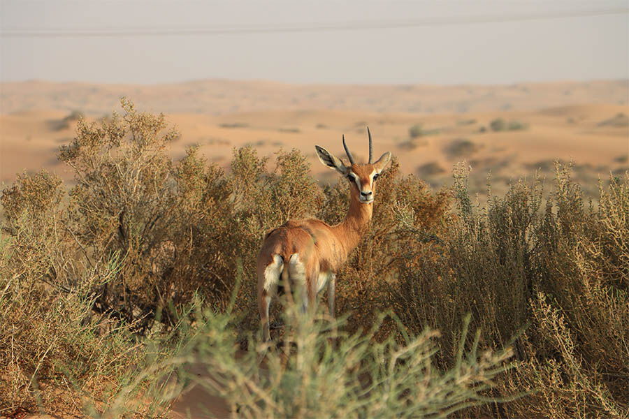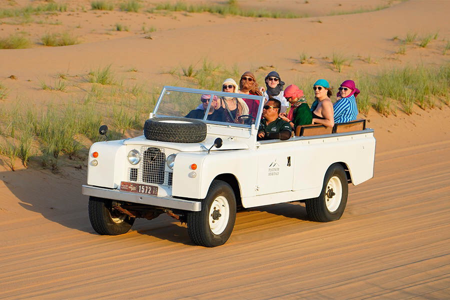 Mein persönliches Dubai-Highlight neben dem 25hours Hotel ist die Wüstensafari mit Platinum Heritage. Das Unternehmen hat sich auf luxuriöse und nachhaltige Events spezialisiert und legt dabei sehr viel Wert auf den Natur- und Artenschutz. Am Nachmittag werden wir von unserem Guide Lionel an unserem Hotel abgeholt und fahren circa 50 Minuten in die Margham Wüste zum Wildlife-Resort von Platinum Heritage, das sich auf einem Privatgrundstück der königlichen Familie befindet und als Naturschutzgebiet ausgezeichnet ist. Dort angekommen, füllen wir unsere Wasserflaschen auf und werden von Lionel mit einem traditionellen Kopftuch ausgestattet. Bereit für das Wüstenerlebnis steigen wir in einen creme-weißen offenen Vintage Land-Rover aus den 50er Jahren, mit dem wir anschließend stilvoll über Sanddünen dem endlosen Horizont entgegen cruisen.