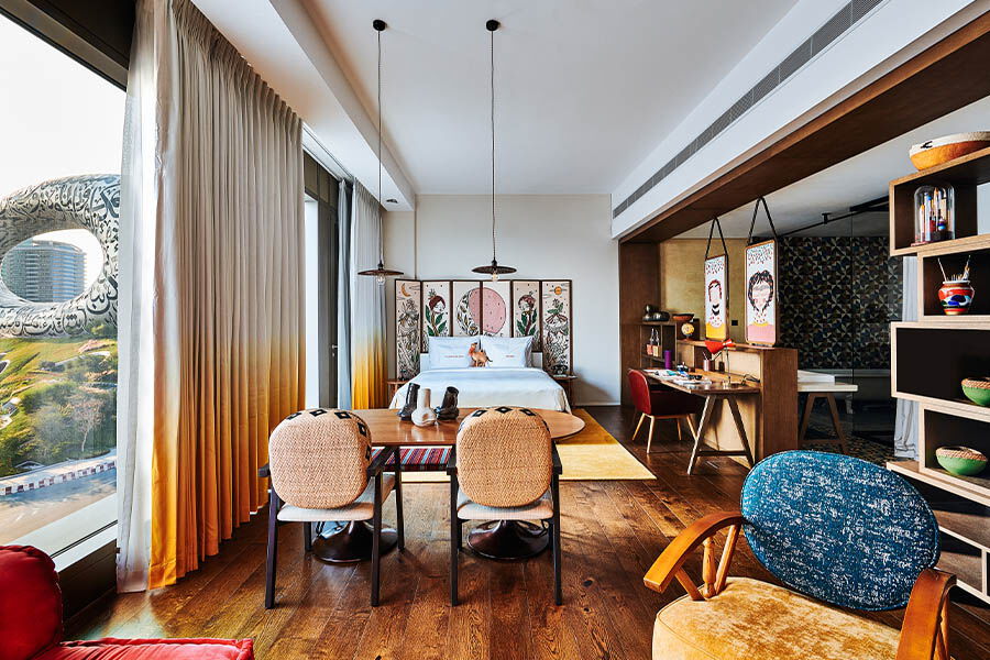 Was dann vielleicht doch schade wäre, denn das 2021 eröffnete One Central liegt, wie der Name schon sagt, mitten im Zentrum von Dubai, genau gegenüber des beeindruckenden Museum of Future. Das ellipsen-förmige Gebäude mit den arabischen Schriftzeichen auf der chromglänzenden Fassade zieht Tag und Nacht die Blicke der Hotelgäste auf sich. Gegenüber lässt das erste 25hours Hotel des mittleren Ostens auf acht Stockwerken sowie in 434 Zimmern und Suiten verschiedener Kategorien das unbeschwerte Flair der traditionellen Beduinen-Völker aufleben und verbindet dieses mit urbanem Zeitgeist und einem zukunftsfähigen Verständnis von Luxus. So befindet sich im sechsten Stock des Gebäudes auch die einzige gemischte Sauna für Männer und Frauen in ganz Dubai, was irgendwie schon ein Zeichen für sich setzt und viel über die Atmosphäre inmitten der arabischen Krondomäne aussagt.