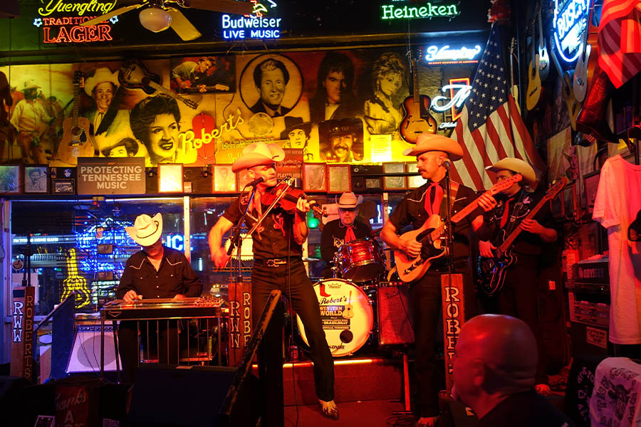 Die Country Music Hall of Fame erscheint als musikalisches Herz im Zentrum der Metropole und die Straßen im Umfeld zeigen sich als pumpende Adern. Von Nachmittag bis spät in die Nacht werden große und kleine Bühnen in den umliegenden Musikbars bespielt und gerockt. Der Broadway ist quasi die Hauptschlagader des Musikkreislaufs. Hier, wo die Bars lautmalerisch Honky-Tonks heißen, versuchen Hunderte von Musikern ihr Glück im Angesicht eines dankbaren Party-Volkes. Jede Bar ist eine Welt für sich, ein pulsierender Mikrokosmos von Klang und Geschichte. Die Luft ist gefüllt mit dem Geruch von verschüttetem Bier und Bourbon. Junge Musiker treten auf kleinen und mittelgroßen Bühnen auf, ihre Stimmen sind oft noch roh und unverfälscht, ihre Augen voller Träume. Die Menge wogt, lacht, singt mit, und für einen Moment verschwimmt immer wieder die Grenze zwischen Künstler und Publikum. Es ist oft ein Rausch, ein ekstatischer Tanz auf dem schmalen Grat zwischen Traum und Wirklichkeit.
