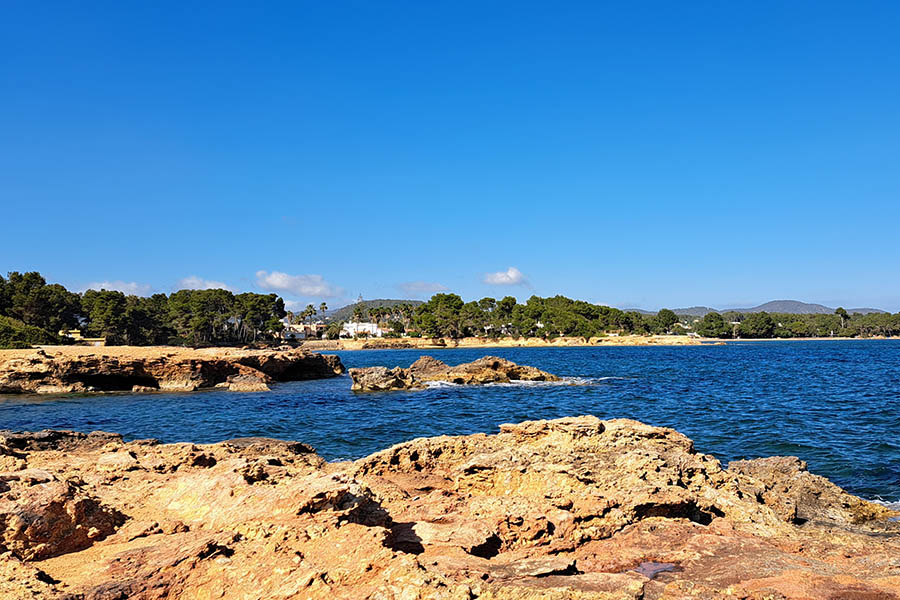 Kennt man die Platja d’en Bossa mehr als Partystrand im Sommer, herrscht in den Frühlingsmonaten vor allem eins: Ruhe. Am Ende des Strandes Richtung Süden starten wir zu einer weiteren Wanderung. Leicht hinauf und hinab geht es, am Wegesrand grüßen Affodill, Lavendel und Rosmarin. Im Blick immerzu die südliche Zunge der Insel, die vorgelagerten, kleinen Inseln sowie die größere Nachbarinsel Formentera, bis wir die Platja des Cavallet mit einem wunderschönen, langen Sandstrand erreichen. Gleich dahinter liegt der Naturpark de ses Salines mit den für das Ökosystem so wichtigen und schützenswerten Seegraswiesen. Zum Welterbe ‚Ibiza, Biodiversität und Kultur‘ zählen neben Kulturstätten auch die artenreichen Seegraswiesen im Südwesten der Insel.