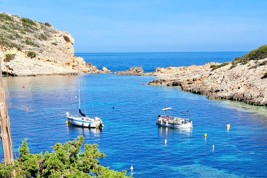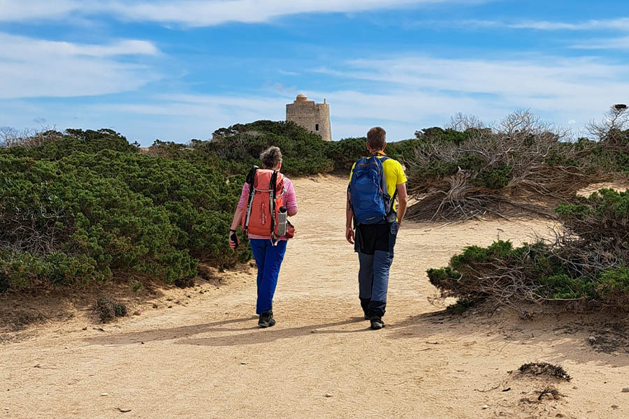 Im nördlichsten Teil der Insel lockt eine ebenso schöne Wanderung ab Pontinatx, einem hübschen Ort, der auch in den Sommermonaten nicht überlaufen ist. Die zerklüfteten Steilküsten führen uns zum Far de Moscater, der mit seinen 52 Metern zu den schönsten Leuchttürmen der Balearen zählt. Es lohnt sich auf alle Fälle, dem Küstenweg weiter Richtung Osten zu folgen, bis zur Cala d’en Serra. Durchs Landesinnere vorbei an Orangenbäumen voller reifer Früchte und durch Felder mit dem leuchtend gelben Sauerklee geht es zurück zum Ausgangspunkt Pontinatx. Die Wanderungen sind zum Teil dürftig ausgeschildert. Hier empfehlen sich geführte Wanderreisen mit einem Anbieter, eine sehr gute eigene GPS-Ausstattung und/oder entsprechende Bücher.