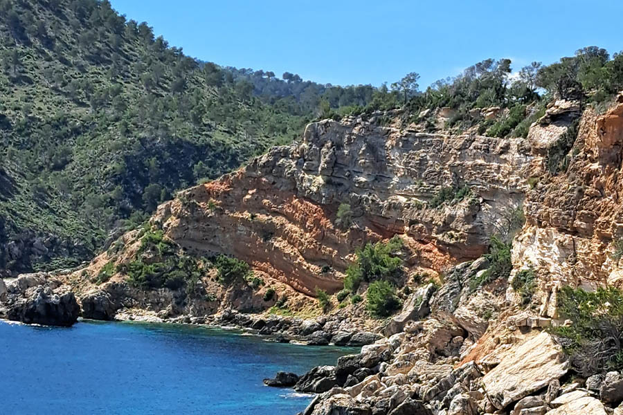 Nahe dem Mandelblütental befindet sich die spektakuläre Felsenküste von Ses Balandres, das Land bricht hier fast 200 Meter senkrecht zum Meer ab. Es besteht die Möglichkeit, über einen schmalen Pfad hinunter zu wandern, bis zum Meer jedoch führt er nicht. Den richtigen Weg zu finden ist anspruchsvoll und sollte daher nicht ohne ortskundigen Begleiter bzw. technischer Ausstattung aufgesucht werden. Unser Guide führt uns über abenteuerliche Wege durch dschungelähnliches Gelände, immer wieder hinauf und hinab entlang der Steilküste, die wir am Ende wieder hinaufsteigen müssen. Auf dem Weg werden wir mit grandiosen Ausblicken auf die Steilküste, Felseninseln und türkisfarbenen Buchten belohnt.