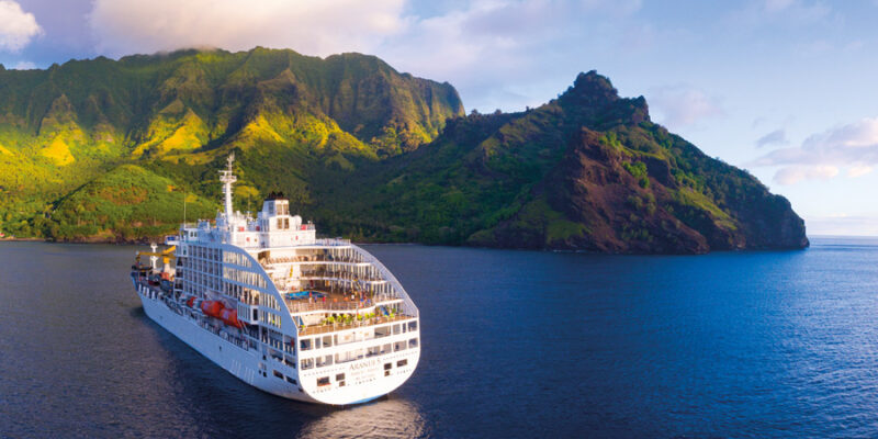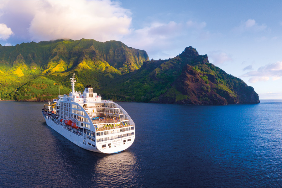 Die fröhliche und ausgelassene Crew erwartet jetzt alle Passagiere am Hafen und schmückt uns alle mit Blumenkränzen, die aus der weißen Tiare-Blume – der National-Blume Französisch-Polynesiens – geflochten sind. Die meisten der insgesamt 103 Kabinen besitzen einen Balkon, das Schiff verfügt über acht Decks für Gäste. Jetzt legt die Aranui ab – und schaukelt sanft in den Abend.