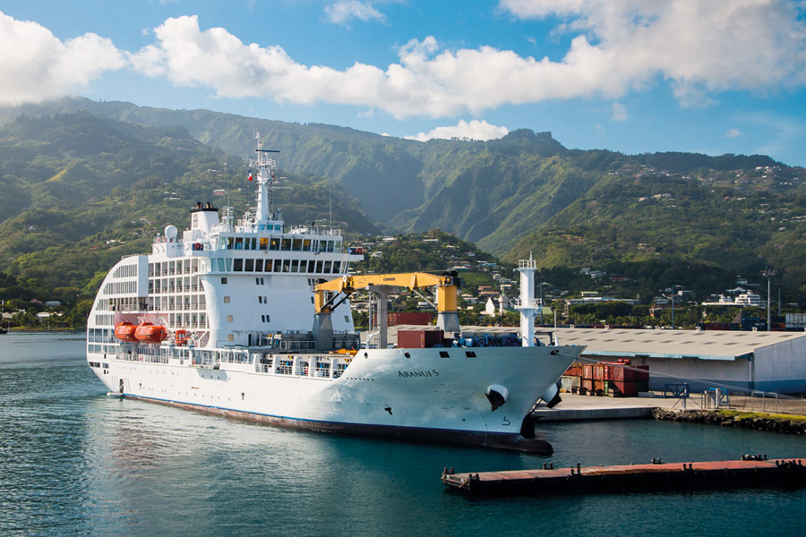 Die Hauptstadt Französisch-Polynesiens, Papeete, liegt im Nordwesten Tahitis. Sehenswert sind vor allem die Kathedrale Notre Dame de Papeete und das Rathaus, das im kolonialen Stil nachgebaut und 1990 von Francois Mitterrand eröffnet wurde. Lebendig geht es in der Markthalle Marche de Papeete zu: Obst und Gemüse shoppt man im Erdgeschoss, .im Obergeschoss werden vor allem Schnitzkunst und Textilien sowie Souvenirs feilgeboten. Draußen vor dem Markt bestaunen wir die mit Blumen hübsch geschmückten Frauen, die an der Außenseite des Marktes Blumenkränze flechten. Vor der Markthalle finden sich auch die Perlenhändler. Die berühmte Tahitiperle ist nirgends so preiswert zu finden wie hier. Der Weg durch die Stadt setzt sich fort, vorbei am Perlen-Museum Robert Wan zum Hafen. Hier landen die Kreuzfahrtschiffe – wie die Aranui 5.