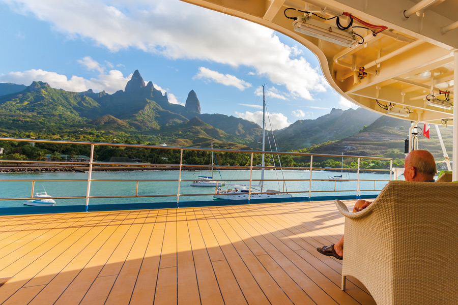 Doch bevor ich dieses besondere Kreuzfahrtschiff betrete, mache ich einen Ausflug nach Moorea. Die rund 133 Quadratkilometer große Nachbarinsel Tahitis ist das Zuhause für rund 17.000 Bewohner. Mit ihren traumhaften Buchten, Bergen und Stränden gilt Moorea als die schönste der Gesellschaftsinseln und als eine der malerischsten Inseln Polynesiens. Wie gut, dass man von Tahiti aus so schnell mit dem Speed-Katamaran in nur 30 Minuten nach Moorea gelangt – auch wenn die Fahrt nichts für Landratten ist. Der Katamaran schießt wirklich rasant über die Wellen. Zur Belohnung warten auf Moorea atemberaubende Ausblicke über Meer und Lagunen.