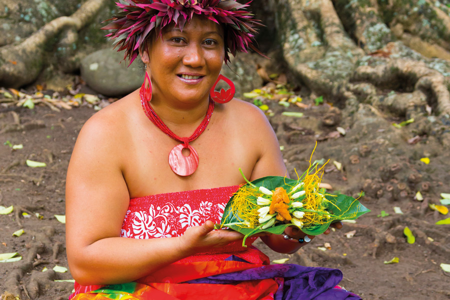 Bald legt die Aranui wieder ab, und gleitet ihrem nächsten Ziel entgegen: Lichtreich gestaltet sich der erste Eindruck bei der Ankunft auf der Insel Fatu Hiva – die mächtigen, grün bewaldeten Klippen und Berge leuchten im morgendlichen Sonnenschein. Kleine Boote schaukeln heftig im deutlichen Wellengang der Bucht vor dem Örtchen Omoa, vor dem das Schiff anlandet. Wer möchte, kann hier eine mehrere Kilometer lange Tageswanderung quer durch die Wälder der Insel machen – bis zur „Bucht der Jungfrauen“ und sich das Naturspektakel aus luftigen Höhen von etwa 600 Metern oberhalb des Meeresspiegels ansehen. Die Bucht verdankt ihren Namen den auffällig geformten Felsen. Eigentlich hieß sie früher Phallus-Bucht. Doch dieser Name war den Kolonialherren und der Kirche zu anzüglich … Man benannte sie kurzerhand um. Später lernen wir auf Fatu Hiva, wie man ein Umu herstellt: Dies ist ein Gebinde aus Kräutern und Blumen, aufgelegt auf einem großen Blatt. Es dient zur Heilung verschiedener Krankheiten – oder einfach zur Erlangung des Wohlbefindens.