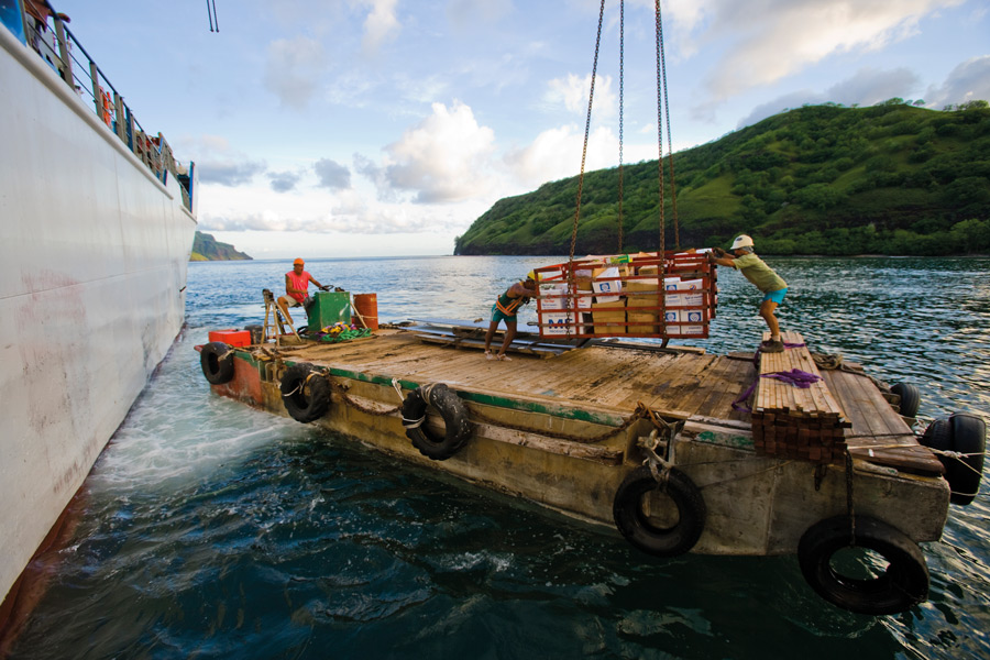 Unsere Kreuzfahrt verläuft weiterhin aufregend: Wir nähern uns bald darauf der Insel Ua Huka – mit dem wohl spektakulärsten Landemanöver für das Schiff während der gesamten Reise. Da sich das Pier des Hafens in einem schmalen Kanal der Bucht von Vaipaee befindet, muss sich der Frachter zum Ankern zunächst um 180 Grad drehen. Dann erst ist es möglich, die Ankertaue am Ufer zu befestigen: Dazu muss ein kleines Boot an den Klippenrand heranfahren und ein Seemann mit dem Tau in der Hand risikoreich auf die Klippen springen. Dort kann er sie vertäuen. Erst dann ist es den Reisenden möglich, mit einer kleinen Barke das Ufer zu erreichen. Abenteuerlich ist bereits der Einstieg in das kleine Boot, weil die Wellen das Bötchen wie eine Nussschale auf und ab treiben.