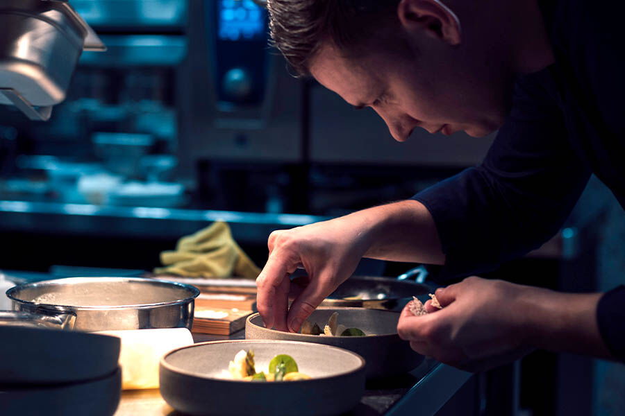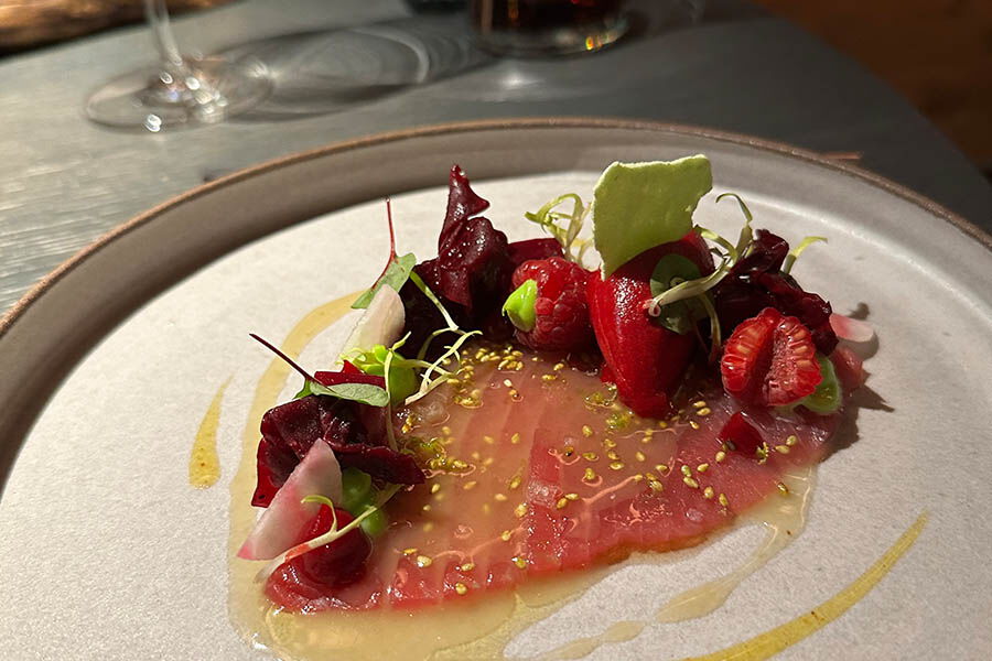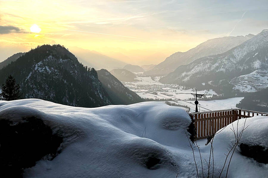 Auch im Wellness-Bereich des Hotels mit Sauna, Sandoase und Heustadl ist der Ausblick von den Ruheliegen oder der Terrasse aus, der magische Höhepunkt. Wenn das Abendrot am Himmel leuchtet und die Sonne sich langsam hinter die riesenhaften Berge schiebt, ist das ein faszinierendes Schauspiel, dass man entspannt und in den Bademantel eingekuschelt, bei einem Glas Bergwasser doppelt und dreifach genießt. Den nächsten Hüpfer macht mein Herz beim Abendessen. Denn das Ambiente könnte nicht romantischer sein. Leicht abgeschirmt sitzen wir bei abgedimmtem Licht in einem runden Samt-Canape – natürlich mit Blick nach draußen. Wer zwischen Donnerstag und Sonntag auf den Falkenstein kommt, kann im sternegekrönten Pavo dinieren. Simon Schlachter, der jüngste Sohn des Hauses, hat als Spitzenkoch erst kürzlich einen Michelin- Stern auf den Berg geholt. Er verzaubert die Gaumen seiner Gäste mit einer internationalen und feinen Kreativküche mit regionalem Pfiff, die den Begriff Royal Fine Cuisine neu definiert. Aber auch die Hotelküche verwöhnt uns mit köstlichen Speisen, die eine harmonische Geschmackssinfonie aufführen und das Burgerlebnis gekonnt abrunden. Später fallen wir glücklich und zufrieden in unser weiches Bett über den Wolken und träumen vom Anblick der aufgehenden Sonne über dem Tal, die uns am nächsten Morgen beim reichhaltigen und regionalen Frühstücksbuffet auch prompt erwartet.