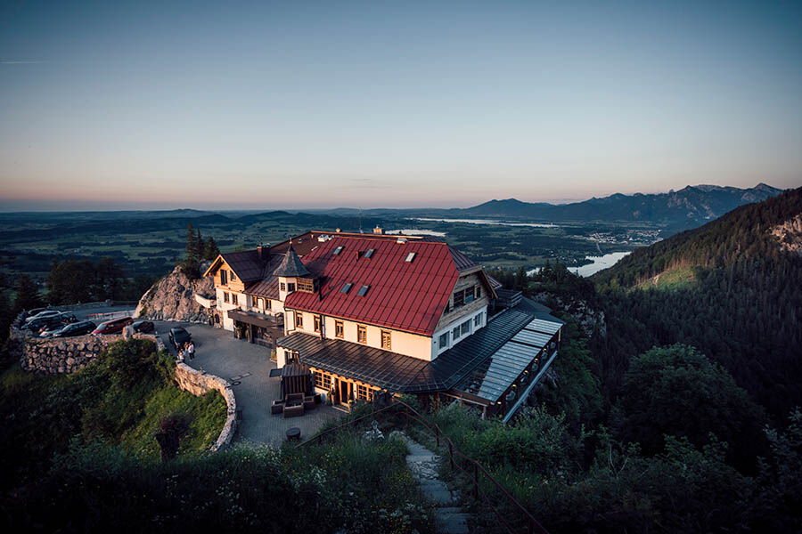 Hier oben, weit weg von Stress und Hektik, Autogeräuschen oder Schnappschuss-Touristen möchten wir uns nur noch von der gemütlichen Atmosphäre einhüllen und wie die zarten Nebelschwaden um die Bergspitzen dahintreiben lassen. Unterbrochen wird das Wohlgefühl lediglich von begeisterten Jauchzern, wenn man z. B. die grandiose Terrasse des Restaurants betritt. Der Anblick der atemberaubenden Bergkulisse und den Gipfeln der Tannheimer Berge in Verbindung mit der mächtigen Felswand des Falkensteins lässt uns minutenlang nicht mehr los. Die Wanderung zum nahegelegenen Weißensee ist fast vergessen und der Lockruf von Schloss Neuschwanstein gleich um die Ecke im Grunde nur noch ein zartes Echo. Hier will man eigentlich nie wieder weg. Erst recht nicht, wenn man einmal eines der traumhaft eingerichteten Themenzimmer bezogen hat. Jedes ist anders. Jedes ist besonders. Mal gibt es eine freistehende Badewanne im Schlafzimmer mit fantastischem Blick auf die Bergspitzen. In einem anderen genießt man denselben Blick von der Terrasse aus, die auch ins marokkanisch geflieste Badezimmer führt. Lila oder petrolfarbener Samt, knorziges Altholz, rauer Naturstein, bunte Fliesen und zarte Spitze machen jedes Zimmer einzigartig und meinen Prinzessinnen-Traum perfekt.