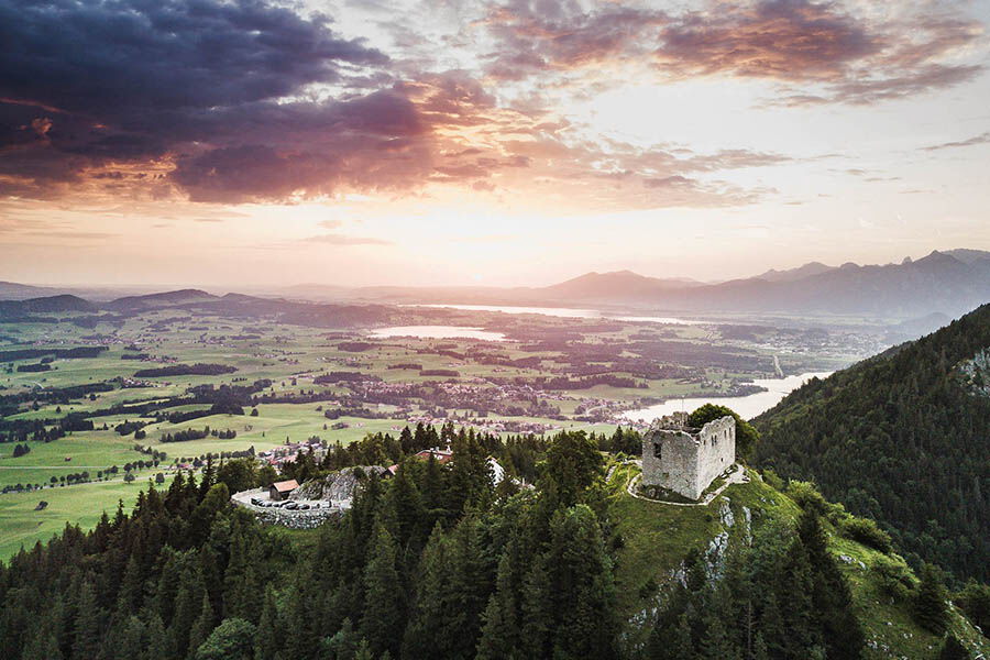Auch wenn ich mein gemütliches Falkennest nur schweren Herzens wieder verlasse – das Ostallgäu und die vielen spannenden Sehenswürdigkeiten im direkten Umfeld des Burghotels sollten auf keinen Fall unbeachtet bleiben. So erkunden wir zunächst die nur wenige Schritte, bzw. Treppenstufen entfernte Burgruine und die etwas tiefer liegende Mariengrotte. Schnell wird klar, warum Ludwig II hier ein weiteres Traumschloss errichten wollte. Die Lage ist einfach zu schön, und die Ruine beschwört quasi eigenständig das Bild der mystischen Falkenburg herauf. Die Pläne dafür waren jedenfalls gemacht. Leider wurde die Realisation durch das frühe Ableben des visionären Märchenkönigs verhindert. Wir folgen den Spuren Ludwigs in das nur 20 km entfernte Hohenschwangau, wo es neben den beiden Königsschlössern auch noch den sagenhaften Alpsee zu entdecken gibt. Noch einen Katzensprung weiter bestaunen wir den Lechfall und unternehmen einen kleinen Stadtbummel durch die entzückende Altstadt von Füssen mit dem imposanten hohen Schloss und der üppig bemalten Spitalkirche. Wer länger im schönen Ostallgäu bleibt, dem stehen noch zahlreiche Seen und Wanderwege zum Erkunden zur Auswahl. Wir für unseren Teil, schaffen es noch so rechtzeitig vor dem Abendessen zurück auf den Falkenstein, dass Zeit für einen genüsslichen Saunagang bleibt.