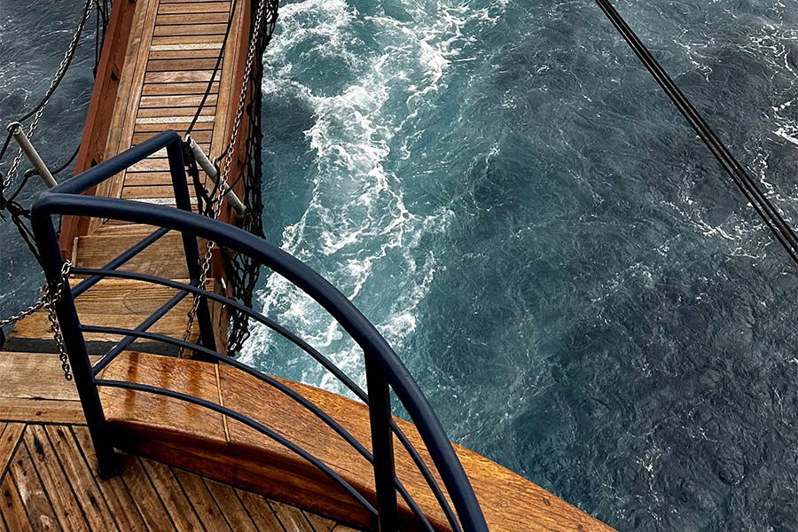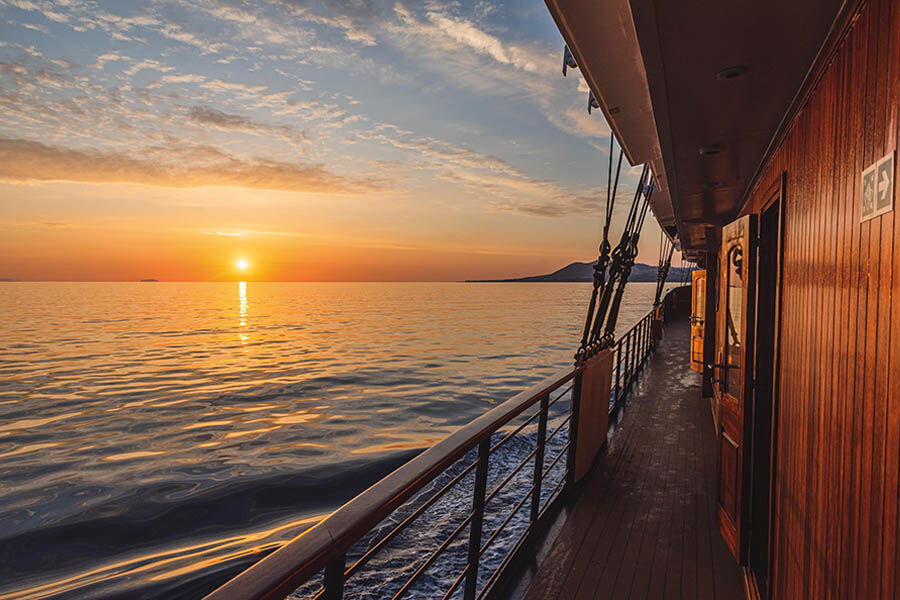Ich erkenne schon am ersten Tag, dass diese Art zu reisen einfach großartig ist. In unserer kleinen Reisegruppe aus ca. 40 Passagieren und 12 Crew-Mitgliedern fühle ich mich, als wäre ich für eine Art Undercover-Mission in einer Zeitkapsel unterwegs. Das kommt wahrscheinlich daher, dass wir auf der Galileo innerhalb kürzester Zeit zu einem eingeschworenen Team zusammenwachsen, das sich das Geheimnis teilt, die schönste Art zu reisen für sich entdeckt zu haben. An einsamen Stränden, verborgenen Örtchen und touristischen Hotspots werden wir für unsere individuellen Erkundungen ausgesetzt und anschließend wieder eingesammelt. Ziel unserer Exkursion ist die Reise zu vollkommener Entspannung und absolutem Genuss. Denn für die nächsten Tage müssen wir uns um absolut gar nichts kümmern. Unser Bett und Gepäck haben wir dabei. Für unser leibliches Wohl ist gesorgt. Die Route steht fest. Wir können uns fallen lassen – in die Arme der See und der schönen Galileo.