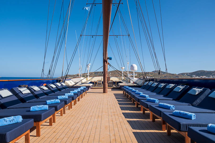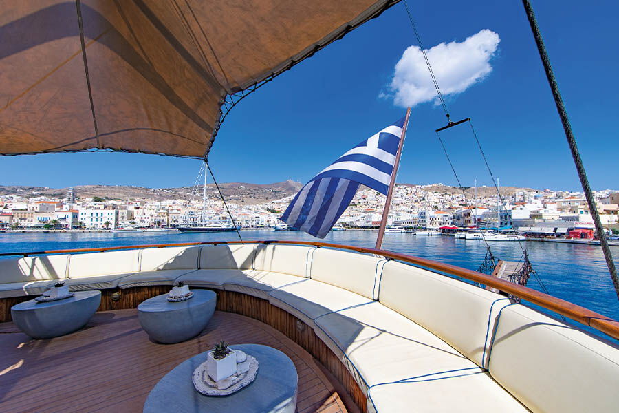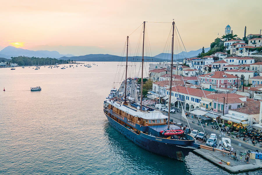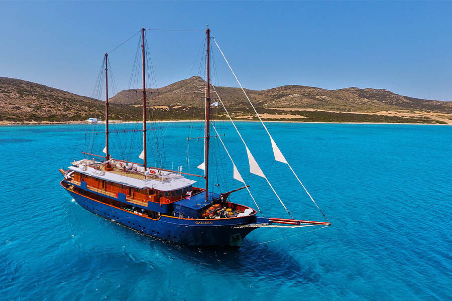 Es ist meine erste Schiffsreise und ich freue mich so sehr darauf. Ich stehe am Pier der Marina Zeas in Athen und bewundere die wunderschöne Galileo, die dort vor Anker liegt. Kastanienbraunes Holz, dunkles Marineblau, drei große Schiffsmasten und schneeweiße Segel machen sie zu einer klassischen Schönheit mit vier Decks und 24 Kabinen. Ich kann mein Glück kaum fassen, dass sie für die nächsten acht Tage mein Zuhause sein wird. Losgelöst vom Festland, dem Wind und den Wellen ausgesetzt, werden wir traumhafte Inseln erkunden und alle Sorgen mit samt dem Alltag ganz tief auf den Grund des Meeres sinken lassen. Nach dem Bezug unserer Kabine, einem fröhlichen Begrüßungsempfang und einem leckeren Cocktail an der Bar stechen wir am Nachmittag in See Richtung Poros, wo wir einen kleinen Zwischenstopp einlegen und unser erstes Dinner an Bord einnehmen, bevor wir die Nacht hindurch zu den Kykladen cruisen.