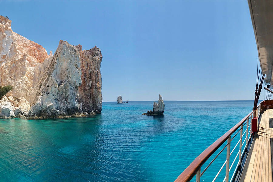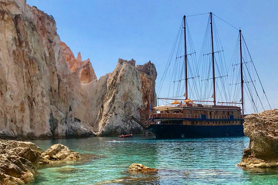 Der Schiffsmotor brummt und das sanfte Schaukeln der Wellen fühlt sich an, als würde man in einer Wiege oder Hängematte liegen. Wir fühlen uns wohl und behütet. Das Meer ist ruhig, heißt uns freundlich willkommen und der Kapitän bringt uns sicher nach Polyegos, der ersten Kykladeninsel auf unserer Route. Polyegos ist unbewohnt und vor allem wegen der schönen Strände und dem türkisblauen Wasser bekannt. Nach dem Frühstück wird, wer möchte, mit dem Tender zu einem hübschen kleinen Strand übergesetzt. Wir räkeln uns im Sand, gehen das erste Mal schwimmen und lassen uns die warme Sonne auf den Bauch scheinen. Zum Lunch veranstaltet die Crew ein kleines Barbecue an Bord. Bei entspannter Launch-Musik schlürfen wir ein eisgekühltes Getränk und genießen die selbstgemachte Pita. Danach legen wir ein kleines Nickerchen auf dem Sonnendeck ein, während uns die Galileo nach Folegandros schippert. So herrlich entspannt, kann es von mir aus gerne weitergehen …