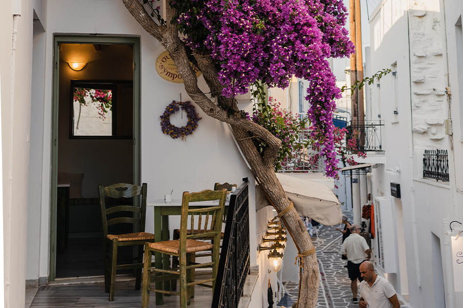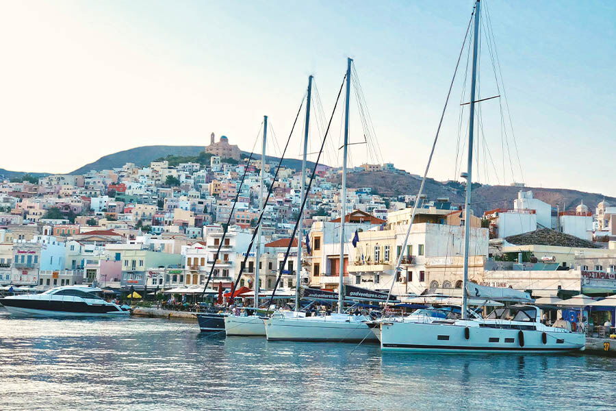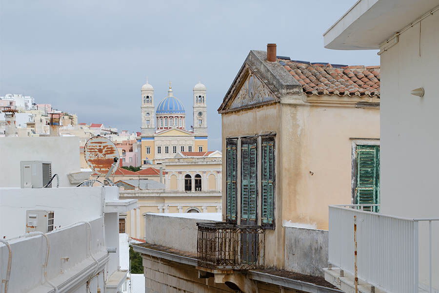 Obwohl sich auf unserer vorletzten Insel die Hauptstadt der Kykladen befindet, gilt Syros noch als Geheimtipp. Hier geht es wenig touristisch zu, was man schon daran merkt, dass man von Locals gegrüßt und, wenn man Glück hat, sogar auf eine Erfrischung eingeladen wird. Vor allem in der Altstadt Ano Syros ist die familiäre Atmosphäre allgegenwärtig. Die engen Gassen schmiegen sich dicht an den Hausberg und vermitteln uns bei unserem Rundgang das Gefühl, wir würden direkt durch die Wohnzimmer der Anwohner spazieren. Unser Guide Adonis erzählt uns einige Anekdoten aus seiner Kindheit, welche uns die griechische Lebensart und Denkweise näherbringen sollen. Und da Praxis immer lehrreicher ist als Theorie, führt er uns auch gleich noch mitten in das traditionelle Zuhause von Maria, die dort, genau wie ihre Großmutter und Urgroßmutter vor ihr, noch Textilien am Webstuhl herstellt. Sie lebt in einem der winzigen Häuschen, das aus zwei Räumen, einer Küche, einem kleinem Bad und einer Terrasse besteht. In ihrem Wohn-, Ess-, und Arbeitszimmer serviert sie uns Kuchen und kandierte Früchte und erzählt uns strahlend, wie sie sich jeden Morgen über den Blick von ihrer Terrasse auf die vorgelagerten Inseln freut. Was für ein einfaches und glückliches Leben, denke ich, und sauge den grandiosen Ausblick gleich noch ein bisschen tiefer in mich auf. Nach dem Besuch der recht modern anmutenden St.-Georgs-Kathedrale, der einzigen römisch-katholischen Kirche auf der Insel, gelangen wir über unzählige Stufen und vorbei an mehreren kleineren Kirchen hinunter in die Innenstadt von Ermoupoli. Hier erwarten uns zahlreiche stattliche historische Gebäude wie z. B. das Rathaus und das Apollo-Theater. Sehenswert sind auch die Agios Nikolaos und die Anastasis Kirche. Überhaupt ist es ratsam, einen Blick in die Kirchen Griechenlands zu werfen. Besonders die griechisch-orthodoxen Kirchen mit ihrer Pracht aus 1001-Nacht, den handgefertigten Ikonen, Choral-Gesängen und dem mit ätherischen Ölen verstärkten Weihrauch-Duft, bieten eine ganz besonders packende Atmosphäre, in der man ein wenig andächtig werden und zur Ruhe kommen kann. Außerhalb der Stadt kann man auf Syros zwischen den weiten Olivenhainen im Norden und sandigen Buchten im Süden einen wunderbaren Natur- und Strandurlaub verleben, der sich mit dem städtischen Flair der Hauptstadt und den typisch griechischen Traditionen verbinden lässt.