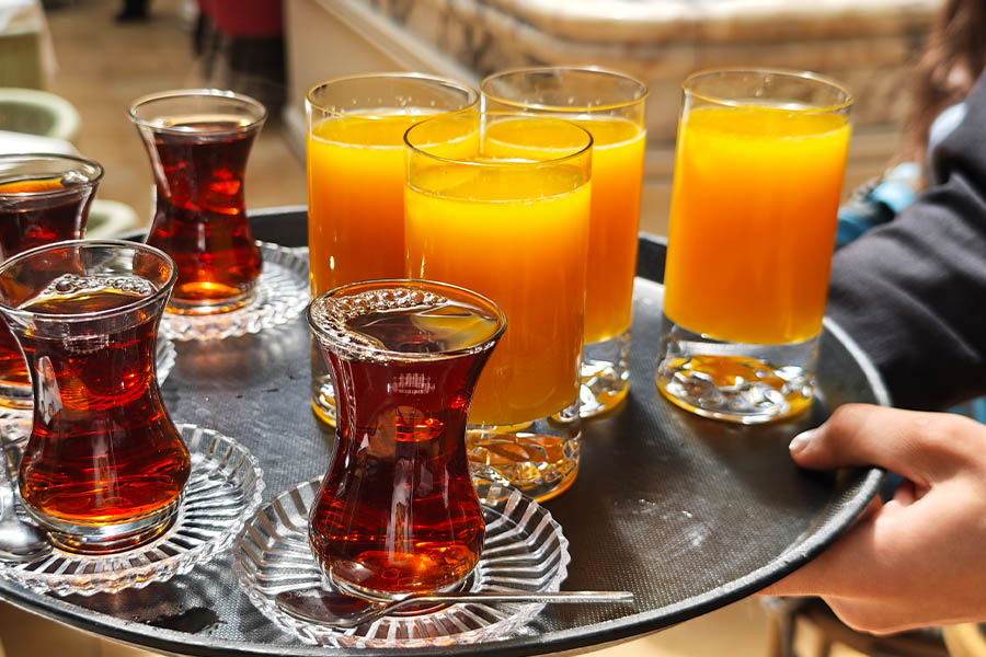 Zum Mittagessen kehre ich in das Hafenviertel Eminönü zurück und genieße ein türkisches Frühstück der Extraklasse: frischer Käse, Oliven, Honig, Menemen (ein herzhaftes Eiergericht) und Simit, das Sesamgebäck der Stadt. Dazu gibt es starken türkischen Tee – der perfekte Start in den Tag. Der Tisch biegt sich ob der zahlreichen aufgetischten Spezialitäten, die mir in der lichtdurchfluteten Halle dieses pompösen Hotels kredenzt werden.