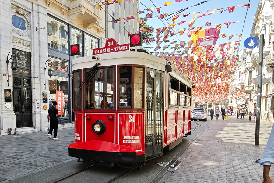- Istiklal Straße, vormals Cadde-i Kebir-Straße nahe dem Taksim Platz – galt früher als bedeutendste Einkaufsstraße Istanbuls