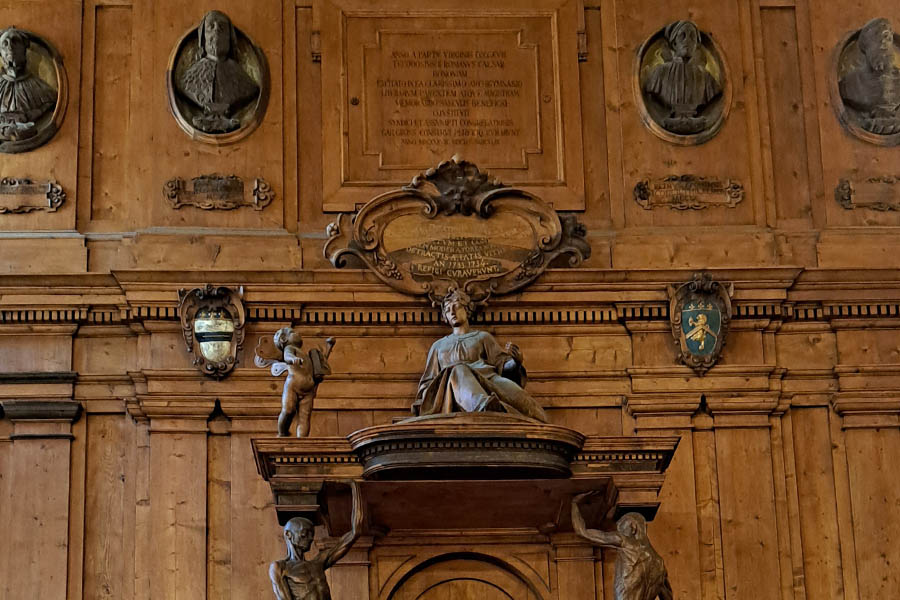 Den zweiten Beinamen ‚la dotta – die Gelehrte‘ verdankt Bologna der 1088 gegründeten Universität, der ersten öffentlichen Bildungsinstitution Europas, das nächste Ziel meines Rundgangs. Die Universität von Bologna zählt 23 Fakultäten. Persönlichkeiten wie Dante Alighieri, Paracelsius, Erasmo da Rotterdam, Raimundo de Pegñafort, Albrecht Dürer, San Carlo Borromeo, Carlo Goldoni waren Studenten der Universität. Zu den bedeutendsten Professoren gehörten der Schriftsteller Umberto Eco und Luigi Galvani, der Entdecker des galvanischen Stromes. Im für den Besucher zugänglichen Amphitheater der Anatomie aus dem Jahr 1637 wurden die anatomischen Vorlesungen gehalten. In der Mitte befindet sich der Marmortisch, auf dem die Sezierungen durchgeführt wurden, die nachts und nur in den Wintermonaten stattfanden. Von den Sitzbänken aus konnten die Studenten die chirurgischen Eingriffe beobachten. Studenten gibt es noch heute, derzeit leben etwa 85.000 Studenten in der Stadt und sorgen für das entsprechende Flair.