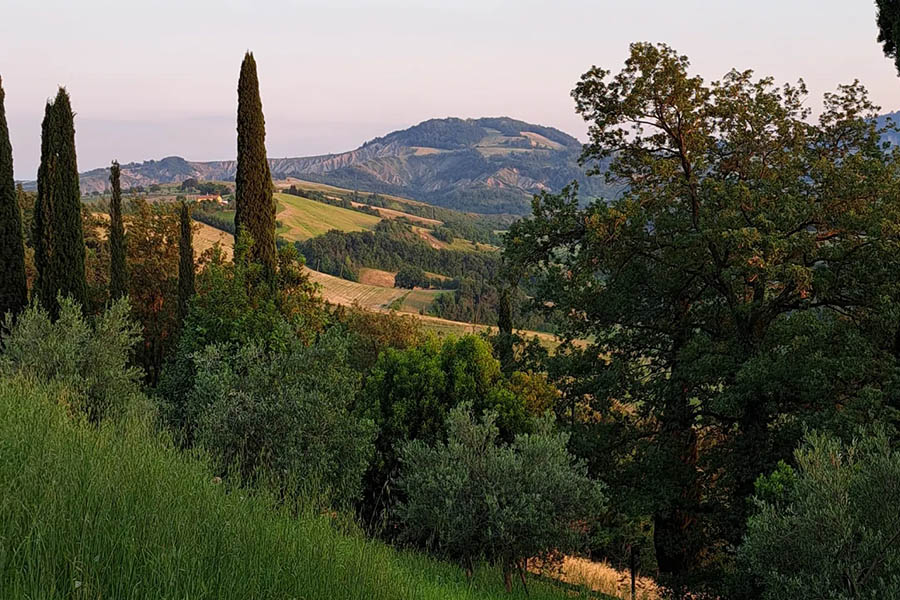 Die grüne, hügelige Landschaft der Emilia-Romagna