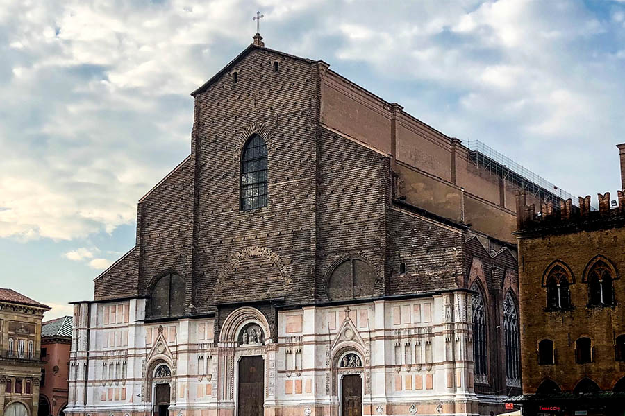 Die Basilika San Petronio im gotischen Baustil ist die fünftgrößte Kirche der Welt (132 m Länge, 60 m Breite und 45 m Höhe) und dominiert die Piazza Maggiore. Sie dient als Symbol für den Stolz der Bologneser auf ihre Stadt und Traditionen. Viele historische Ereignisse und politische Versammlungen fanden in der Basilika statt, was ihre Bedeutung als historisches und kulturelles Erbe unterstreicht. Der Bau begann 1390. Vorhaben der durch Fernhandel reich gewordenen Kommune war, die Dombauten von Florenz und Mailand bei weitem zu übertreffen. Im Laufe der langen Bauzeit jedoch versiegten die finanziellen Quellen, die Pläne wurden geändert und der Bau sogar irgendwann eingestellt. Deutlich wird das an der Außenfassade, die lediglich im unteren Bereich mit Marmor verziert ist. Der Kircheninnenraum ist mit zahlreichen Kunstwerken, darunter Fresken, Skulpturen und einzigartigen architektonischen Elementen beeindruckend. In der Kirche befindet sich ein in den Fußboden eingelassener Meridian von 66,8 m Länge, ein Werk des Astronomen Giovanni Domenico Cassini. Ein Sonnenstrahl um die Mittagszeit zeigt Monat, Tag, Sternzeichen und die Zeit von und bis zur Tag-und-Nacht-Gleiche. Noch heute ist der 1655 in den Kirchenboden eingelassenen Meridian der längste der Welt.