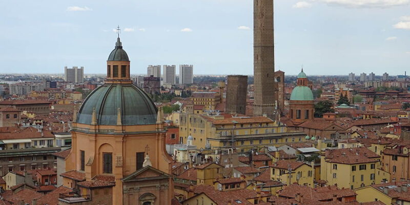 Ganz in der Nähe stehen die Due Torri, die beiden Wehrtürme und gleichzeitig das Wahrzeichen der Stadt, die zu Beginn des 12. Jahrhunderts errichtet wurden. Die Geschlechtertürme wurden im Mittelalter von den wohlhabenden Familien errichtet, einige davon wurden früher als Wohntürme genutzt. In den Chroniken der Stadt wurden 193 solcher Türme beschrieben, heute sind es leider nur noch etwa 20. Der niedrigere Turm des Ensembles, der Torre Garisenda, ist tatsächlich schiefer als der bekannte Schiefe Turm von Pisa. Mit 48 Meter Höhe weist eine beachtliche Neigung von etwa 3,2 Metern auf. Den Torre Asinelli (97 m hoch mit 2,23 m Neigung) kann über Stufen bestiegen werden, Tickets unbedingt vorher online buchen. Von oben hat man eine wunderbare Aussicht auf die Stadt und stellt schnell fest, dass die roten bis ockerfarbenen Häuser und Dächer das Stadtbild prägen. Daher kommt auch einer der drei Beinamen der Stadt: la rossa, die Rote.