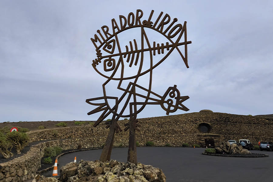 Da ich schon einmal im Norden bin, begebe ich mich zum Mirador del Rio, einem weiteren Monument, das durch Manrique ausgebaut wurde. Vorbei am pittoresken Hafenstädtchen Orzola, von dem man nicht nur mit der Fähre zur Insel La Graciosa gelangt, sondern vor allem auch hervorragend Fisch essen kann in einem der zahlreichen Restaurants dort, gelange ich über steile Serpentinen zu der etwas im Inselinneren gelegen Stätte. Eigentlich nur ein Aussichtspunkt auf die vor Lanzarote gelagerte Insel La Graciosa, aber doch so viel mehr. Hier geht ein Wind, dass es einen fast wegweht. Ich flüchte mich in die Lavakuppel, die auf der Spitze des Berges zu einem Aussichtspunkt ausgebaut wurde. War am Jameos des Agua der Krebs das Symbol der Stätte, so ist es hier der Fisch, der außen weithin sichtbar vor dem Baukunstwerk steht. Ein Café mit Panoramafenstern, innen kurvenreich gestaltet, erwartet mich und eröffnet mir einen atemberaubenden Ausblick auf das Inselende, nach La Graciosa und die Weiten des Atlantiks. Der 1974 fertiggestellte Aussichtspunkt gilt als der schönste der Insel.