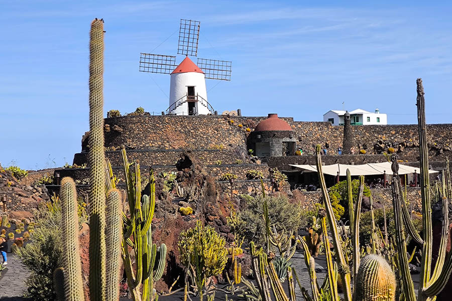 Richtung Inselsüden gelange ich zum Jardin de Cactus. Hier hat sich Manrique nahe dem Dorf Guatiza 1991 als eines seiner späten Werke einen Garten mit 1100 verschiedenen Kakteenarten einfallen lassen. 4500 Stachelgewächse sind es insgesamt und auf der Erhebung im Garten thront weithin sichtbar eine Windmühle. Die Verbindung von Architektur und Natur, die dem Künstler so wichtig war, kommt hier besonders gut heraus.