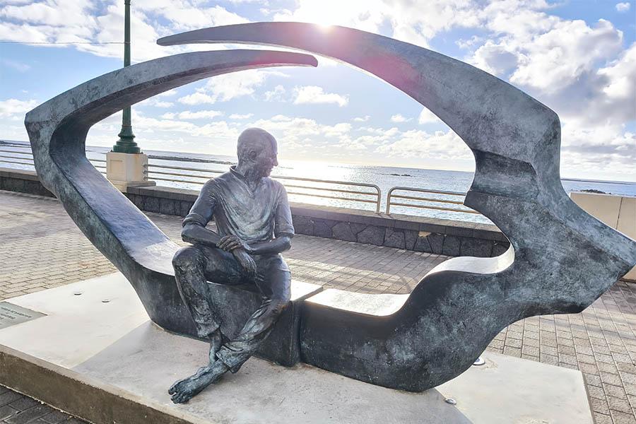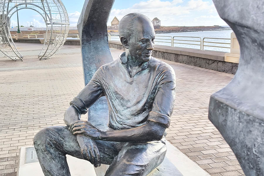Schon wieder ein Windspiel, eines wie so viele auf dieser Insel, die wie kaum eine andere Kanareninsel durch einen einzigen Künstler nachhaltig und Tourismus-wirksam geprägt wurde. Cesar Manrique auf Lanzarote. Just an diesem Kreisverkehr, der 1992 noch eine Kreuzung war, starb der berühmte Künstler unweit seiner Stiftung beim Örtchen Tahiche. Am 25. September war das, als der 73-jährige einen selbstverschuldeten Unfall verursachte, den er nicht überlebte. Reisende nach Lanzarote landen seit 2019 auf dem nach ihm benannten Flughafen und schwärmen von dort aus, die Insel nach Manriques Spuren zu erkunden. Damit ist man gut 10 Tage beschäftigt, will man sich einen vertieften Einblick in das Leben des Lanzaroteños verschaffen. Der am 24. April 1919 auf der Insel geborene Manrique blickte auf ein wechselvolles Leben zurück. Aufgewachsen in Puerto Naos, dem alten Hafen der heutigen Hauptstadt Arecife, kämpfte er als Freiwilliger an der Seite des faschistischen Diktators Franco, studierte später Bauingenieur auf Teneriffa, besuchte die Kunstakademie in Madrid, zog in den 60er Jahren nach New York und kehrte schließlich 1968 nach Lanzarote zurück, um die Insel in „einen der schönsten Plätze der Welt zu verwandeln“ wie er es selbst formulierte. In Peppin Ramirez Cerdá, dem damaligen Inselpräsidenten fand er einen wichtigen Verbündeten und Freund, um sein Vorhaben umsetzen zu können. So wurde Manriques Anregung, alle Häuser auf der Insel in traditionellem Stil weiß zu halten mit grünen Fensterläden und nicht höher als zwei Stockwerke, nicht höher als eine Palme, zu bauen, konsequent umgesetzt, nicht zuletzt durch sein eigenes Werben für diese Idee auf der Insel. Diese Regelung besteht bis auf ganz wenige Ausnahmen bis heute noch.