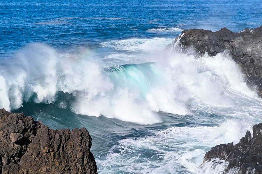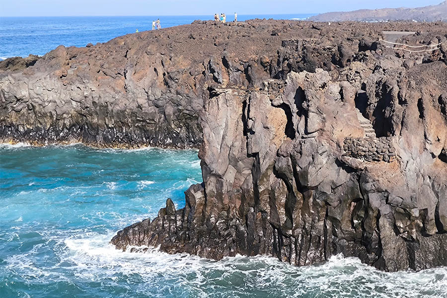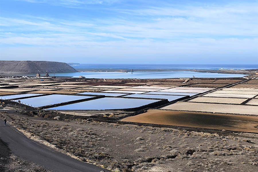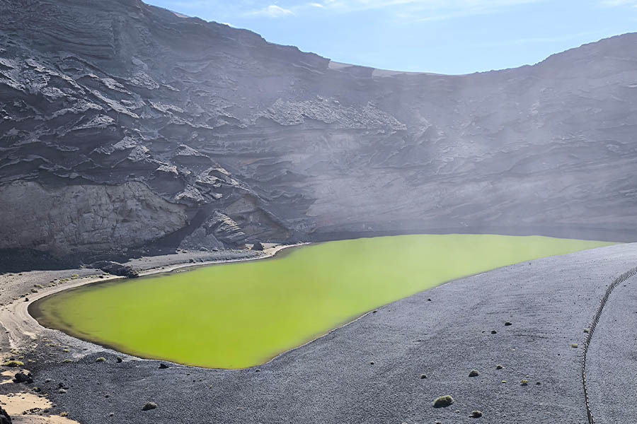 Es ist schon eine skurrile Welt, die ich auf Lanzarote antreffe. Die Lagune El Golfo eröffnet sich mir als ein grünes Becken südlich eines ehemaligen Fischerdörfchens. Ein teilweise im Meer versunkener Krater des Vulkans Montańa, 50 Meter von der Küste entfernt kommt in grüner Färbung daher, hervorgerufen durch einzellige Algen, die in dem salzigen Gewässer leben. Unterirdisch strömt Wasser von und zum Meer und hält das Gleichgewicht des Gewässers aufrecht. Mirador del Charco de los Clocos heißt der Punkt, von dem aus ich das Naturspektakel beobachten kann. Und wenn ich schon in der Gegend bin, besuche ich direkt auch den nahegelegenen Aussichtspunkt Los Hervideros, an dem das Meer sich in gewaltiger Brandung atemberaubend gegen die Klippen und in eine ausgespülte Grotte schlägt. Hier spürt und sieht man das Zusammentreffen der Naturgewalten hautnah.