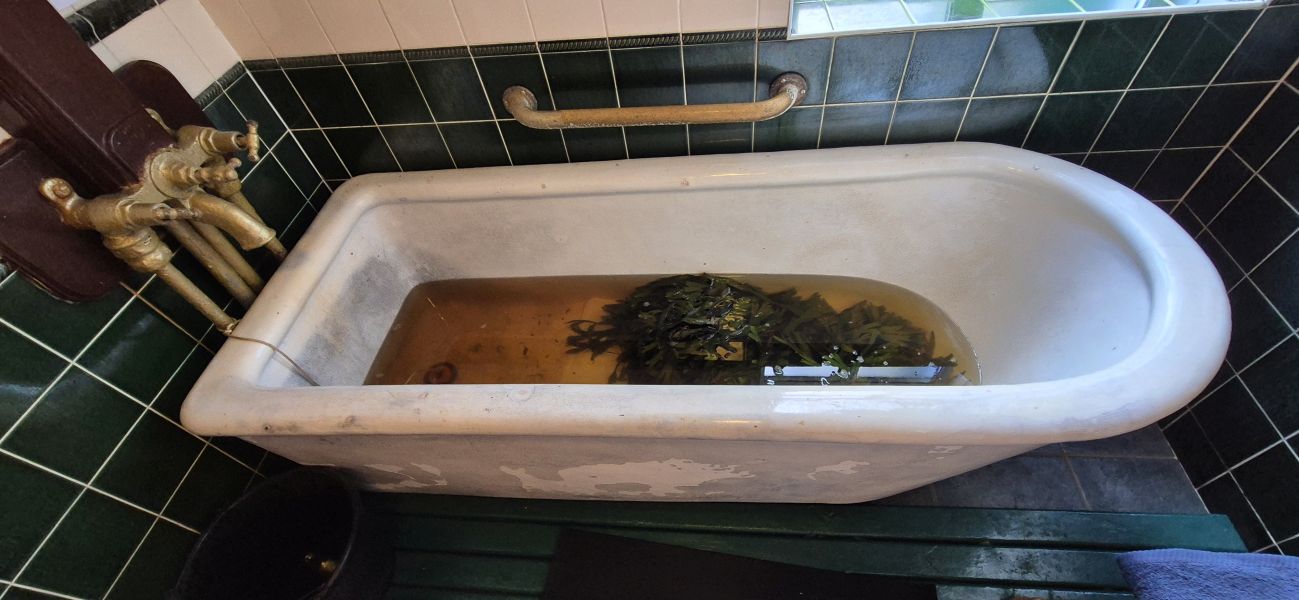 In der Nähe von Mullaghmore, im malerischen Cliffony, haben Gaby und Walter Wieland ihren Kraftort gestaltet. Vor 40 Jahren wanderten die beiden mit ihren drei kleinen Kindern aus Deutschland aus, um sich hier ihr persönliches Paradies zu schaffen: Neantóg, was auf Irisch so viel wie „Brennnessel“ bedeutet. Die Wielands leben hier nahezu als Selbstversorger, bauen Gemüse an, pflegen Obstbäume und Kräuterbeete. Sie ernten reichlich und bieten Koch- und Kräuterkurse an. Ihre Produkte verkaufen sie in kleinem Umfang direkt vom Hof. Ihre Geschichte ist eine von Bescheidenheit und Reichtum zugleich. Mit nur wenigen Habseligkeiten kamen sie hierher und erzählen heute mit leisen, aber überzeugenden Stimmen, wie reich sie sich fühlen – reich an Natur, an Freiheit und an dem, was sie mit ihren eigenen Händen geschaffen haben. Nach einer Kostprobe ihrer hausgemachten Säfte und mit Pesto bestrichenen Crackern wächst in uns der Wunsch, auch unserer Haut etwas Gutes zu tun. In Enniscrone, tauchen wir in eine uralte irische Tradition ein. Das 1912 erbaute Enniscrone Seaweed Bath entführt uns in eine Zeit, in der das Baden noch zelebriert wurde. Hier stehen originalporzellanene Badewannen mit protzigen Messingarmaturen und hölzerne Dampfkabinen. Jeden Morgen sammelt das Personal die Algen direkt am Strand vor dem Haus und bereitet sie schonend auf. Dieser Prozess setzt einen Sud frei, der zusammen mit den Algen in die Badewanne gefüllt wird, ergänzt durch warmes Meerwasser aus der Leitung. Die Anwendung beginnt in der Dampfkabine, aus der nur noch mein Kopf oben aus einer Öffnung herausragt. Ich aktiviere den Dampf mit einem Hebel, die Haut kann nun ihre Poren öffnen. Anschließend lege ich mich in die mit den aufbereiteten Algen gefüllte Badewanne. Das anfangs etwas befremdliche Gefühl weicht schnell einer tiefen Entspannung. Ein Film aus Algen legt sich auf die Haut und hinterlässt ein wunderbar weiches und erfrischtes Gefühl.