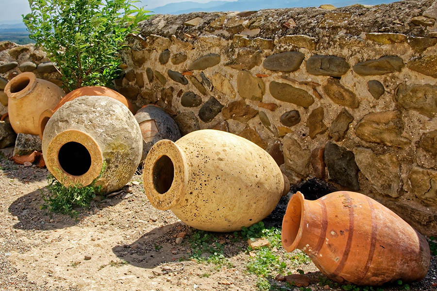 Hier erfahre ich viel über die georgische Weinkultur, die bereits 8000 Jahre Geschichte aufweist. Die Tradition wurde niemals unterbrochen, so dass die Georgier ihre Region stolz als „Geburtsort des Weins“ bezeichnen. In der Region Schulaveri im zentralen Teil Transkaukasien finden sich die ältesten Stätten des Weinkellerei. Der Wein wurde vor allem in sogenannten Kwewris ausgebaut. Dabei handelt es sich um spitz zulaufende Tonkrüge mit 50 bis 100, teilweise sogar bis 1000 Liter Fassungsvermögen. Das Filterverfahren ist ca. tausend Jahre alt und ausgesprochen natürlich, denn nach der Fermentation wird der Trester abgeschöpft. Die spitz zulaufenden amorphen Krüge werden in die Erde eingelassen, wodurch eine natürliche Kühlung entsteht. Nach diesem traditionellen Verfahren wird heute allerdings nur noch 5% des georgischen Weins produziert. Sagenhafte 525 Weinsorten gibt es in Georgien, die meist im Norden und Süden des Landes produziert werden. Etwa 70% aller Weine – darunter vier Rotweinsorten – kommen aus Kachetien. Andere Weinbauregionen sind Kartlien, Imeretien und Ratscha-Letschchumi. Im Herbst finden sich in der Gegend um das Alaverdi Kloster unzählige Lastwagen, gefüllt mit roten Trauben, die zur Kelter und Weiterverarbeitung unterwegs sind.