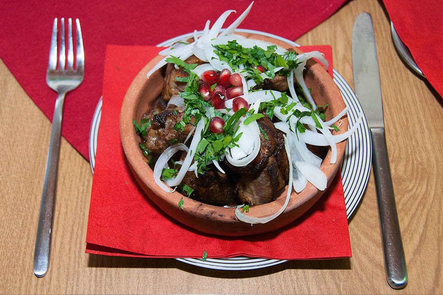 Ich reise noch ein Stück weiter, denn schließlich möchte ich auch noch etwas über die georgische Kulinarik erfahren. Mit viel Gemüse bilden deftiges Fleisch vom Schwein, Rind und Lamm die zentralen Bestandteile der georgischen Küche. Bereits in den vergangenen Tagen habe ich einige georgische Spezialitäten kennenlernen dürfen – zur Vorspeise z. B. mit Walnusspaste gefüllte Auberginen, Badridschani, Spinatsalat mit Walnüssen oder im Tontopf gebackene Pilze. Immer dazu gehört Katschapuri, ein Brot Frischkäse Ei und Öl, die bekannten Chinkali – das sind mit Fleisch gefüllte Knödel, welche als markante Säckchen serviert und mit der Hand verzehrt – quasi ausgesaugt werden, damit man den leckeren Sud im Inneren des Beutels mit genießen kann. Die Füllung besteht traditionell aus Hackfleisch, Kräutern, Kartoffeln, Käse oder Pilzen. Als Hauptgericht wird gerne ein Schaschlik mit Schwein- oder Rindfleisch serviert. Dazu gibt es meist gemischtes Gemüse, wie Tomaten, mit Frischkäse und grünem Salat.