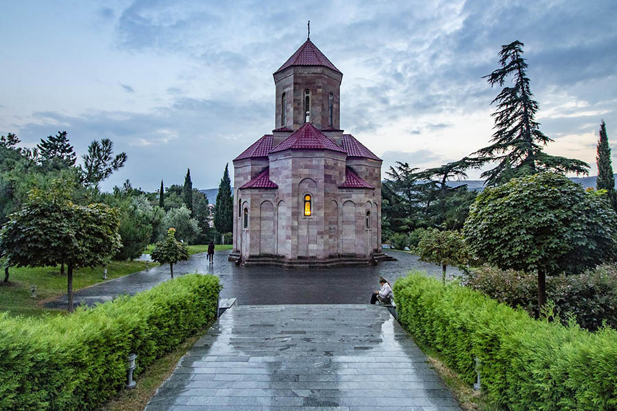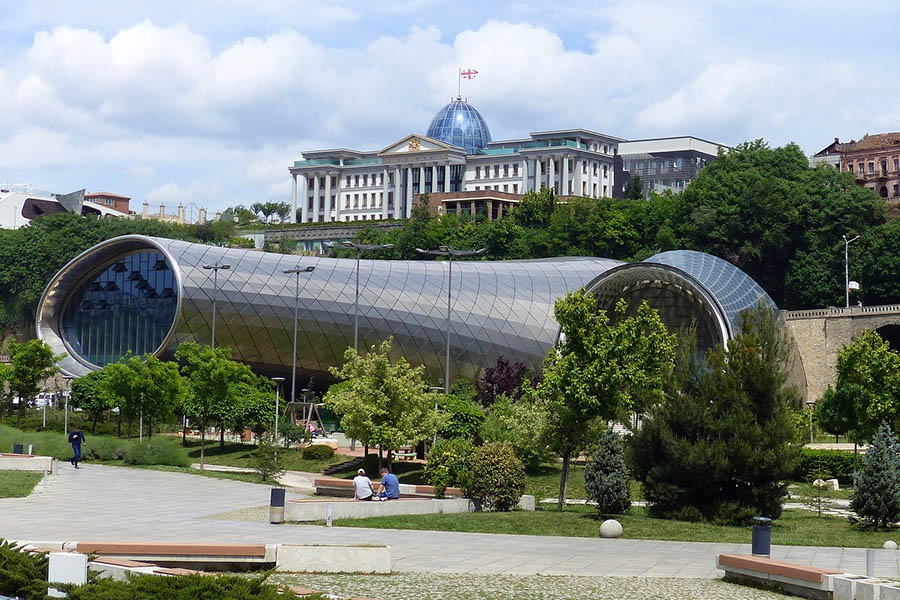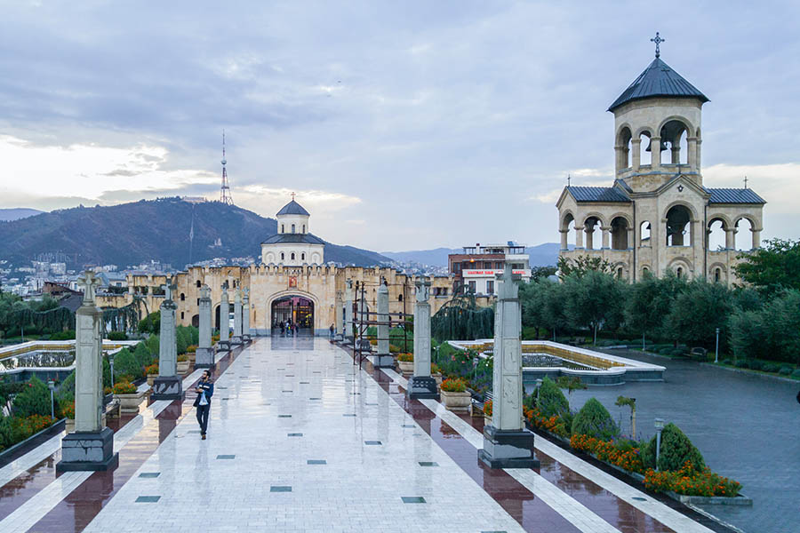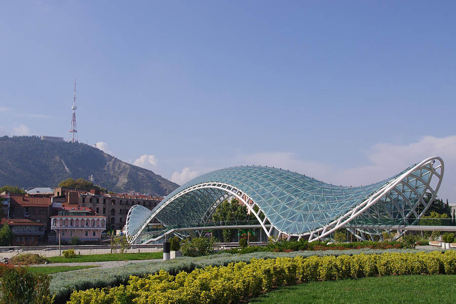 Farbenfroh rollt sich die Stadt unter mir aus. Ich blicke von der Festung Nariqala auf die georgische Hauptstadt Tiflis und ihre malerische Altstadt. Der gläserne Korpus der Friedensbrücke leuchtet in den Abendstunden, während die Sameba-Kathedrale in warmem Gelb vom gegenüberliegenden Berg strahlt. Lebendig, geradezu quirlig erscheint die Stadt, als sei sie mit dem Sonnenuntergang erst zum Leben erwacht. Die traditionsreiche, fast 1.500 Jahre alte Hauptstadt Georgiens sticht vor allem durch ihre Prachtbauten hervor. Die pulsierende Hauptverkehrsstraße Rustaveli-Avenue, benannt nach dem wohl bekanntesten georgischen Dichter, hieß ursprünglich Sassachilis Kutcha – zu deutsch „Palaststraße“ und bildete im 19. Jhdt das Zentrum von Tiflis.