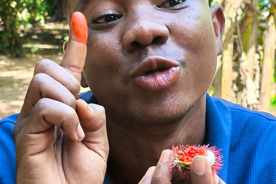 Die tägliche Hitze von über 30 Grad und die hohe Luftfeuchtigkeit sind verantwortlich für die tropenähnlichen Zustände. Nelken, Zimt, Kardamom, Ingwer, Vanille und Muskatnuss sind die wichtigsten Gewürze, die hier wachsen. Das erfahre ich auf einer Gewürzfarm im Inselinneren. Gewürze, die man sonst nur in Pulver- oder getrockneter Form kennt, werden hier angebaut. Manch einer sieht einen Zimtbaum zum ersten Mal. Die Rinde ist es, die später getrocknet, geraspelt und pulverisiert das Gewürz ergibt. Ich sehe zu, wie eine Ingwer-Wurzel ausgegraben wird, wie Lemongras geerntet und getrocknet wird, um daraus später Tee zu bereiten. Die Hibiskusblüte ist es, die als Tee auf der Insel am häufigsten verwendet wird. Vanille, als lange Frucht am Baum, ist für den europäischen Besucher ebenso erstaunlich zu sehen, wie eine Durian-Frucht, mit ihrer stacheligen Schale und ihrem unangenehm riechenden, aber süß schmeckenden Innenleben. Nicht umsonst wird sie als „Stinkfrucht“ bezeichnet, obschon sie sehr vitaminreich ist. Der würzige Kardamom prägt nicht nur Speisen, er hilft als Tee auch bei Erkältung. Ich wandle durch den Garten der Farm, von einer Nutzpflanze zur anderen. Gerüche, Aromen und die Eigentümlichkeit der Pflanzen faszinieren mich als Besucher dieser Plantage, von denen es zahlreiche auf der Insel gibt.