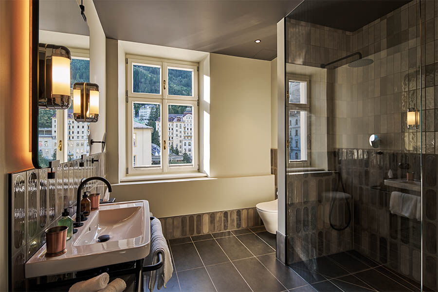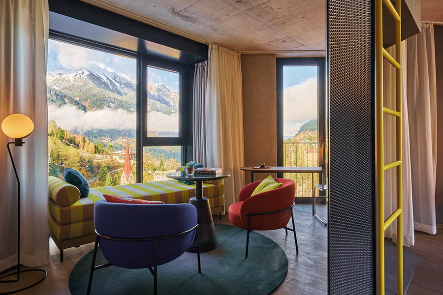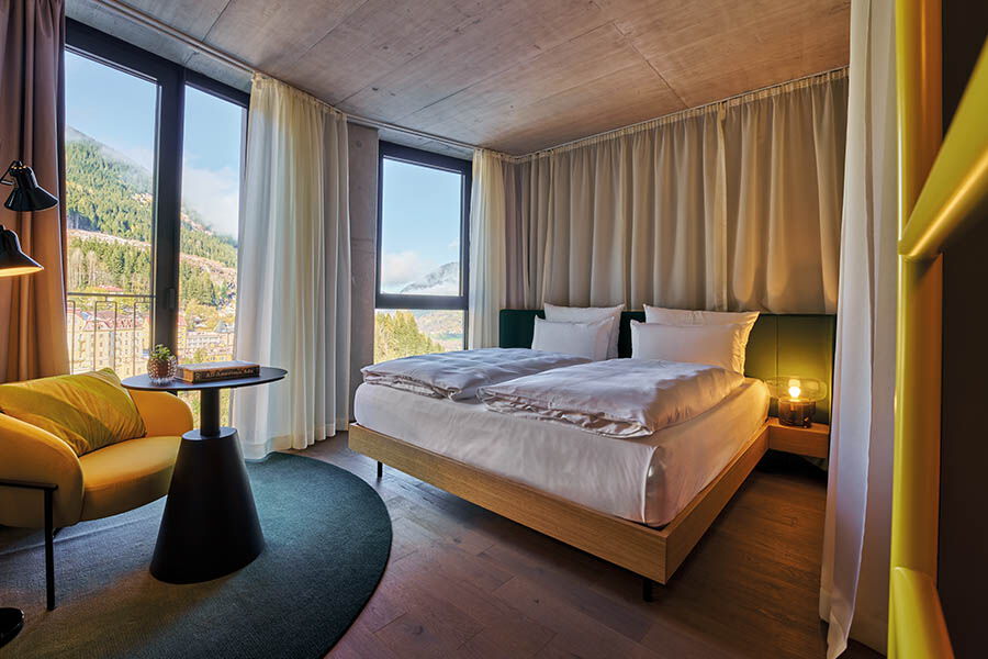 Den Nachmittag verbringe ich mit meiner Freundin bei einem ausgiebigen Wellness-Programm im Alpine Swim Club, der sich in den drei obersten Etagen unseres Rapunzelturms befindet. Die Aussicht auf das grandiose Umfeld macht sowohl das Schwitzen in der Panoramasauna wie auch das Relaxen auf gestreiften Kissen und das Schwimmen im Rooftop-Pool zu einem unvergesslichen Erlebnis. Am Abend lassen wir uns von Auntie Heidi verwöhnen. Ihre Rezepte aus aller Welt werden im Badeschloss- Restaurant modern interpretiert und als leckeres Soulfood serviert. Viele vegane und vegetarische Optionen, sowie Sharing-Menüs, die einen bunten Querschnitt durch die Speisekarte bieten, laden zum gemeinsamen Schlemmen ein. Danach gönnen wir uns einen leckeren Cocktail an der Kaminbar, bevor wir uns für unseren Schönheitsschlaf zurückziehen und darauf hoffen, ebenso grunderneuert wie die beiden Hotelgebäude und am besten von zwei heldenhaften Bergprinzen wachgeküsst zu werden.