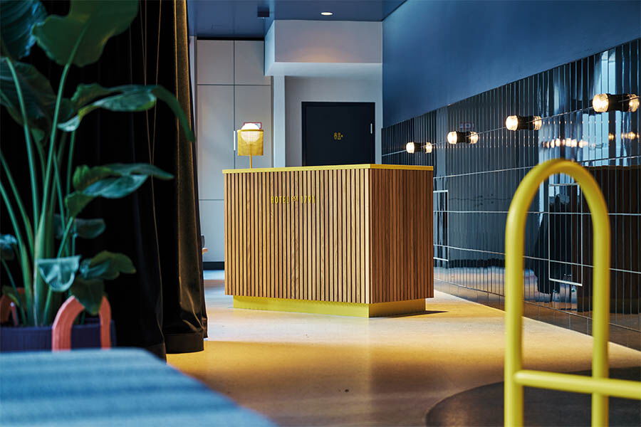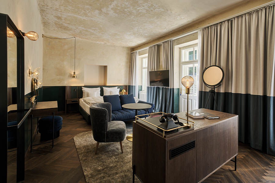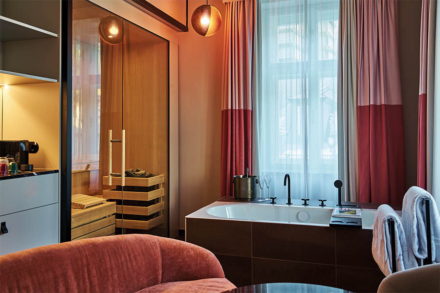 Das ehemalige Schlossgebäude, Baujahr 1791, das später zur öffentlichen Badeanstalt umfunktioniert wurde, umfasst nach der aufwändigen Renovierung zum Vier-Sterne-Lifestyle-Hotel 102 Zimmer und Suiten, einen dreistöckigen Spa-Bereich, ein Restaurant mit offener Showküche, eine Schlossbar, eine Kaminbar sowie mehrere separate Räumlichkeiten, wie z. B. das kuschelige Wohnzimmer. Im Zuge des Umbaus wurde das historische Gebäude um einen 14-stöckigen Hotelturm erweitert, in dem wir übernachten dürfen. So wächst das Badeschloss über seine große Vergangenheit mit kosmopolitischer Lebendigkeit hinaus. Ob ein angedeutetes Sprungbrett als lange Tafel, Schwimmbad-Armbändchen als Schrankknopf, Metall-Spint als Garderobe, Badewanne mitten im Zimmer oder eine Schwimmbadleiter als Deko-Element – die Badekultur und das Element Wasser sind allgegenwärtig und äußerst kreativ sowie designstark in den alten und neuen Räumen integriert.