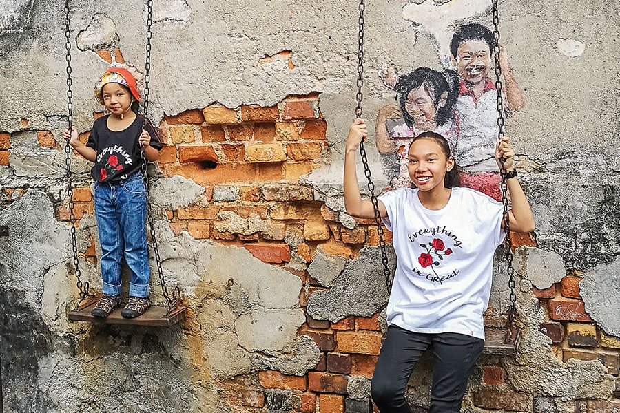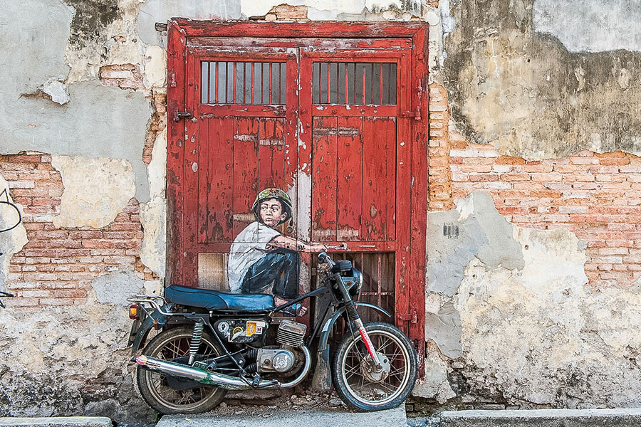 Der litauische Künstler Ernest Zacharevic schuf in der Chulia Street – aber auch in anderen Gassen der Innenstadt – einige seiner bekanntesten Arbeiten. Jährlich kommen weitere originelle Bilder an den Wänden dazu. Sie erfreuen sich auf Grund ihrer 3-D-Optik höchster Beliebtheit bei Reisenden. Denn man kann vielfach ein Teil des Straßenkunstwerkes werden – z. B., indem man sich auf einer Bank oder Schaukel neben der gemalten Figur niederlässt. Motive aus dem täglichen Leben, prominente Gesichter und kitschige Szenen kann der aufmerksame Flaneur in den Straßen der Hauptstadt Penangs entdecken. Das bekannteste Kunstwerk sind wohl die „Kids on Bicycle“. Hier versammelt sich regelmäßig eine Menschentraube.