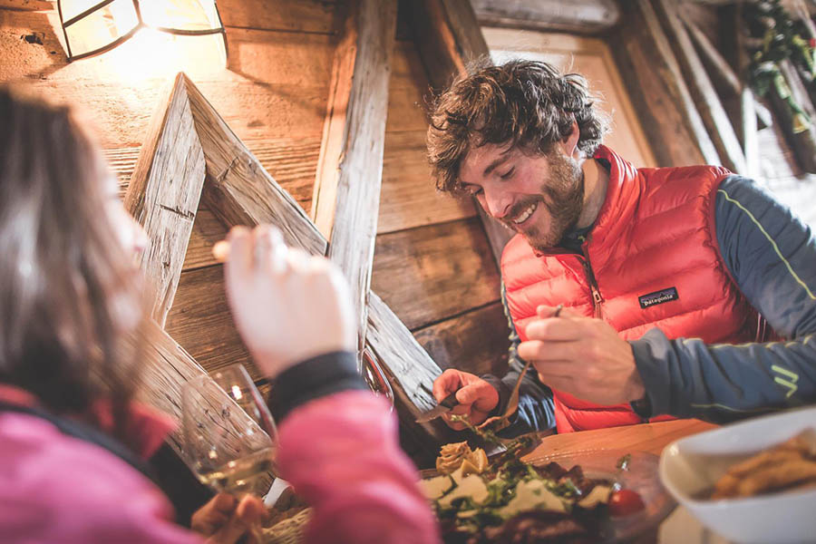 Wer es ganz still mag, zieht sich ins Pfitscher Tal zurück. Winterwanderer, Schneeschuhgeher oder Langläufer wie ich finden im nahegelegenen Ursprungstal (Val di Vizze) ideale Voraussetzungen. Das Hochtal auf knapp 1500 Meter Höhe ist in meinen Augen ein echter Geheimtipp. Kurz hinter St. Jakob liegt das Ende des Tals und damit ist die Region entsprechend wenig frequentiert. Ich empfinde die Stille hier als absoluten Luxus, außer dem gelegentlichen Läuten der Kirchturmuhr und dem Gleitgeräusch meiner Langlaufskier ist hier absolut nichts zur hören. In den Sommermonaten ist das Tal ein idealer Ausgangspunkt für leichte Wanderrouten bis anspruchsvolle Touren ins hochalpine Gelände. Und ganz neu: Der Klettersteig Ölberg bei Afens in Pfitsch erfreut die trittsicheren und schwindelfreien Kraxler mit einer ca. 550 m Kletterlänge. Die passende Ausrüstung kann im Hochseilgarten „Skytrek“ in Sterzing ausgeliehen werden. Ein unvergessliches Erlebnis für Geübte ist die Bergtour zum Hochfeiler auf 3510 Meter. Übrigens endet hier im Pfitschtal bzw. in Sterzing auch der beliebte Weitwanderweg ‚Alpenüberquerung‘, der am Tegernsee startet und durchs Zillertal führt. Auf dem Rückweg Richtung Sterzing entdecke ich den Graushof in Afens, eine kleine idyllisch gelegene Pension mit Gasthaus, deren traditionelle Südtiroler Köstlichkeiten und italienische Spezialitäten begeistern.